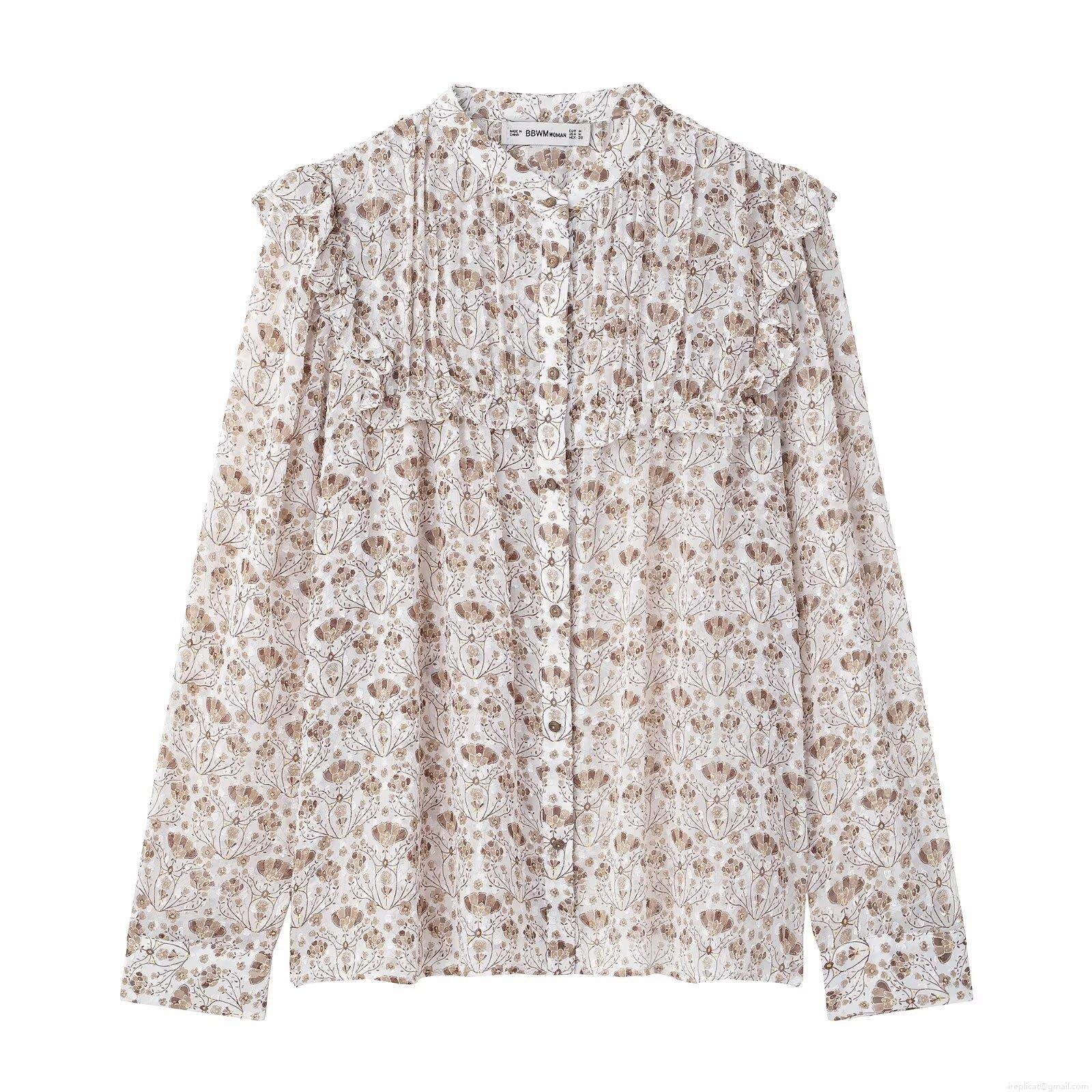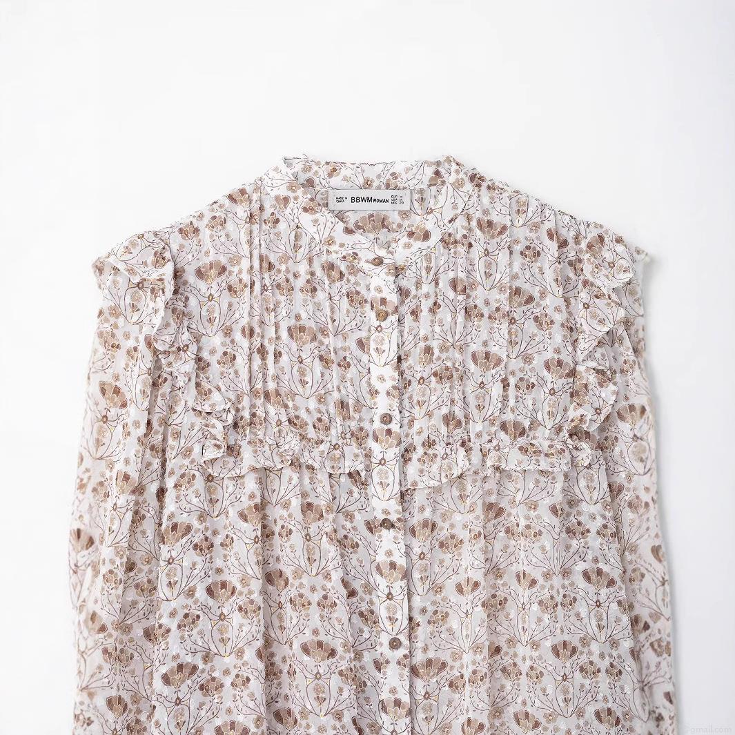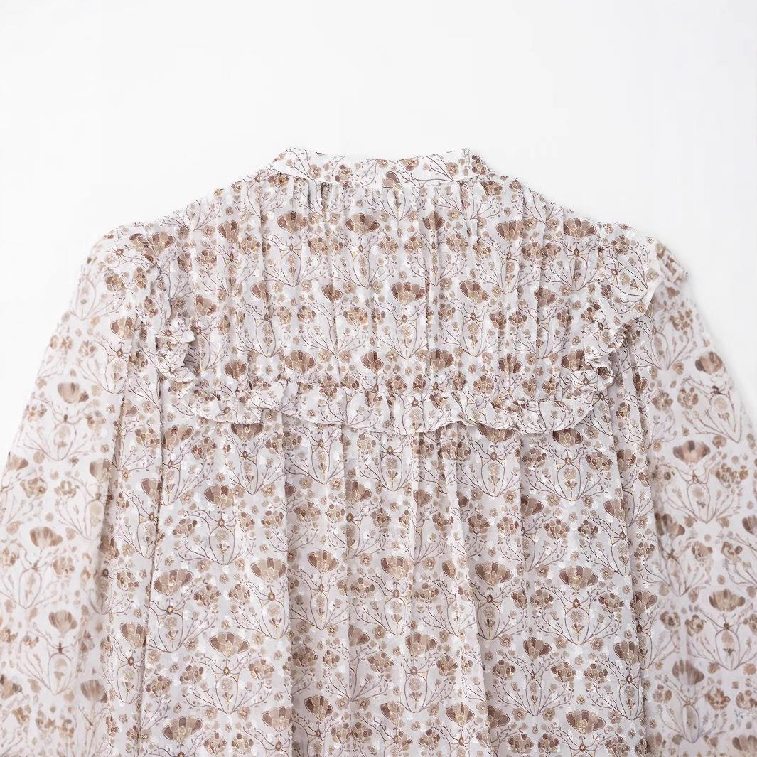 • Women's Vintage V-Neck Floral Print Chiffon Blouse With Ruffles Long Sleeve Single Breasted Sheer Dobby Top For Daily Dating Vacation