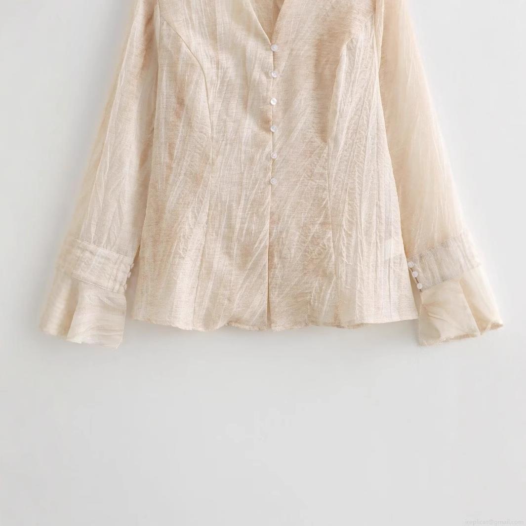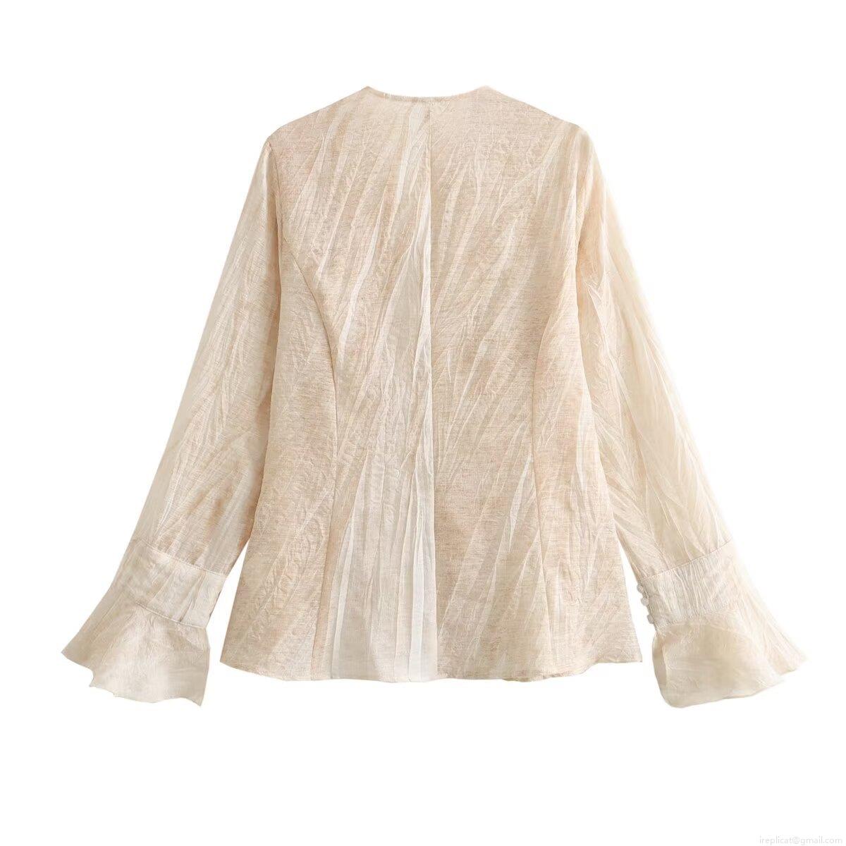 • Women's V-Neck Flare Sleeve Blouse Solid Color Elegant Pleated Texture Single Breasted Long Sleeve Casual Retro Shirts For Ladies Spring Summer Daily Dating Tops