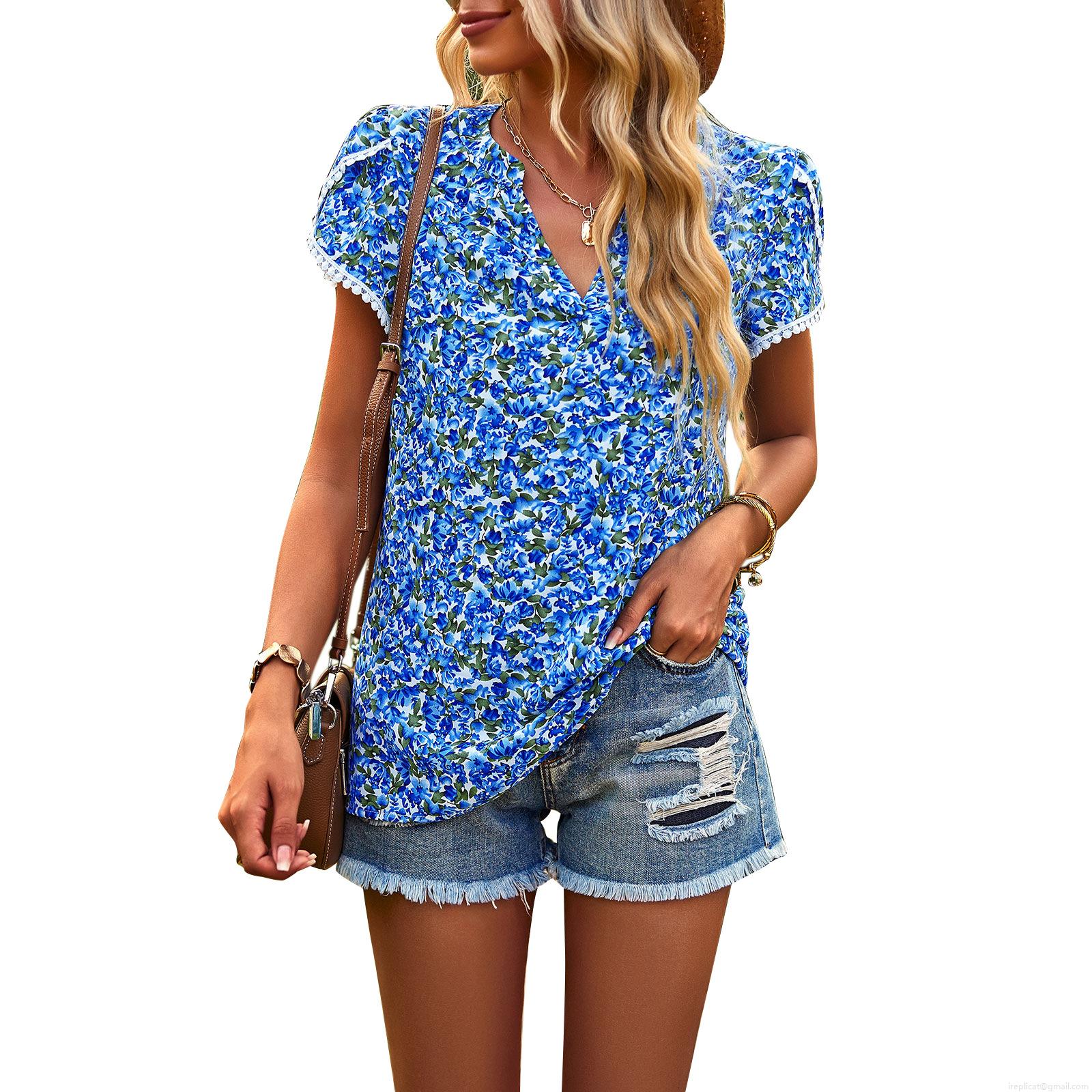 • Women's V-Neck Floral Print Chiffon Blouse Petal Sleeve Lace Trim Casual Loose Summer T-Shirt Elegant Commuter Tops for Ladies
