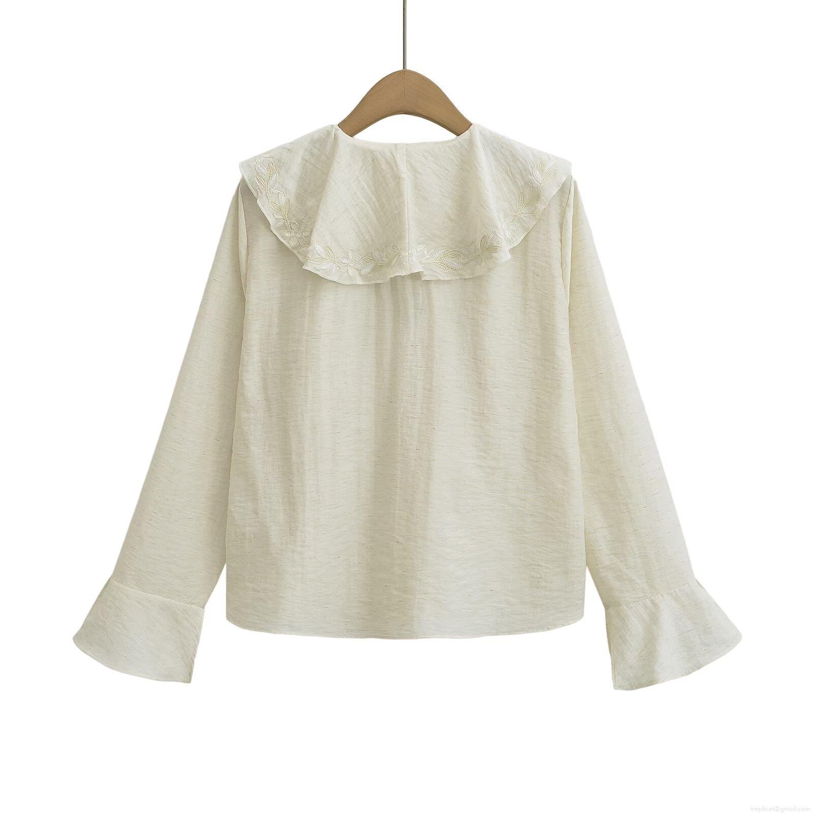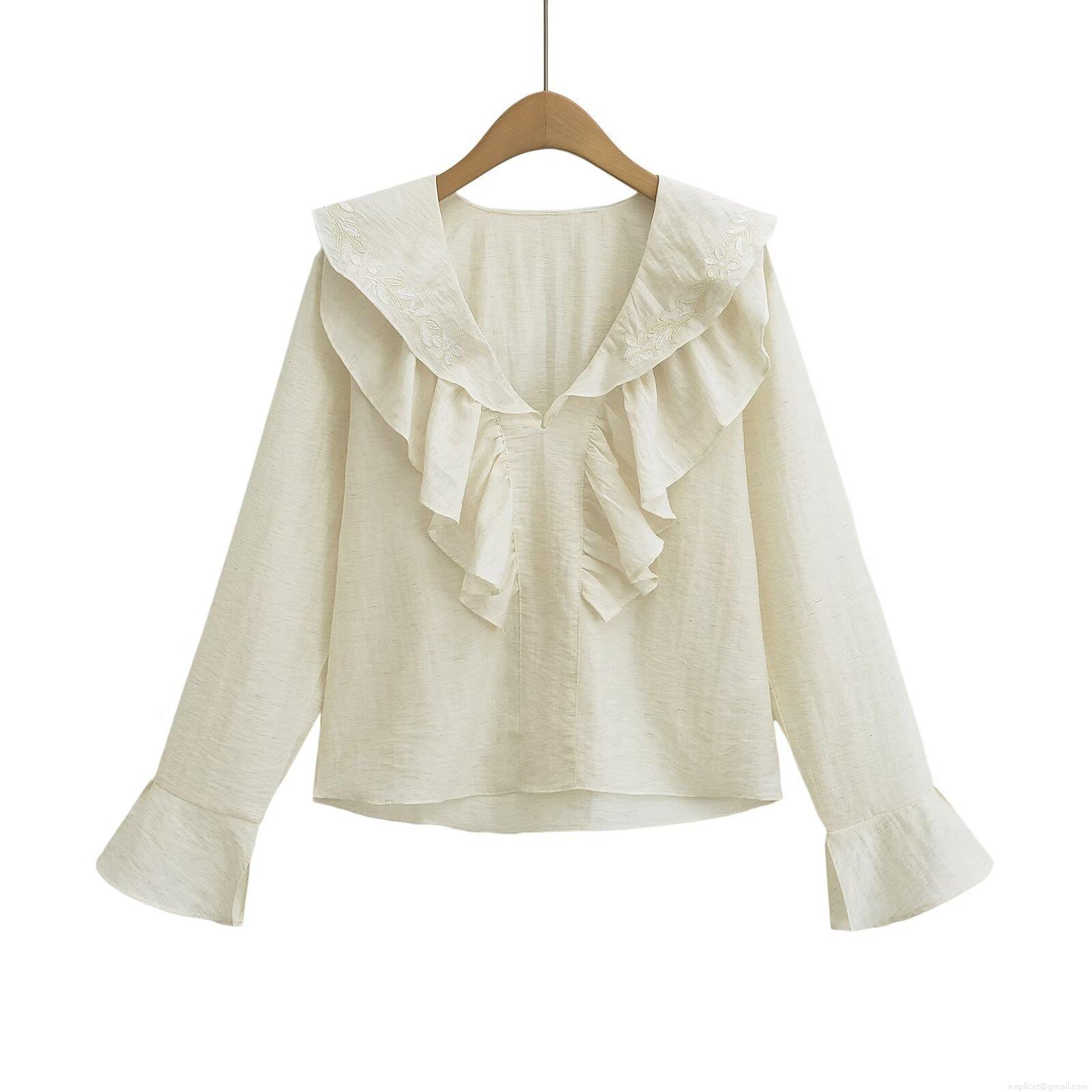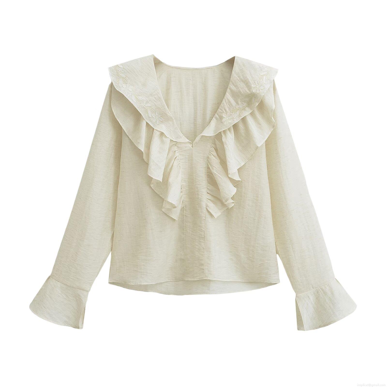 • Women's V-Neck Long Sleeve Embroidered Blouse With Ruffles Elegant Polyester Chiffon Shirt For Daily Dating Sweet Retro Style Top