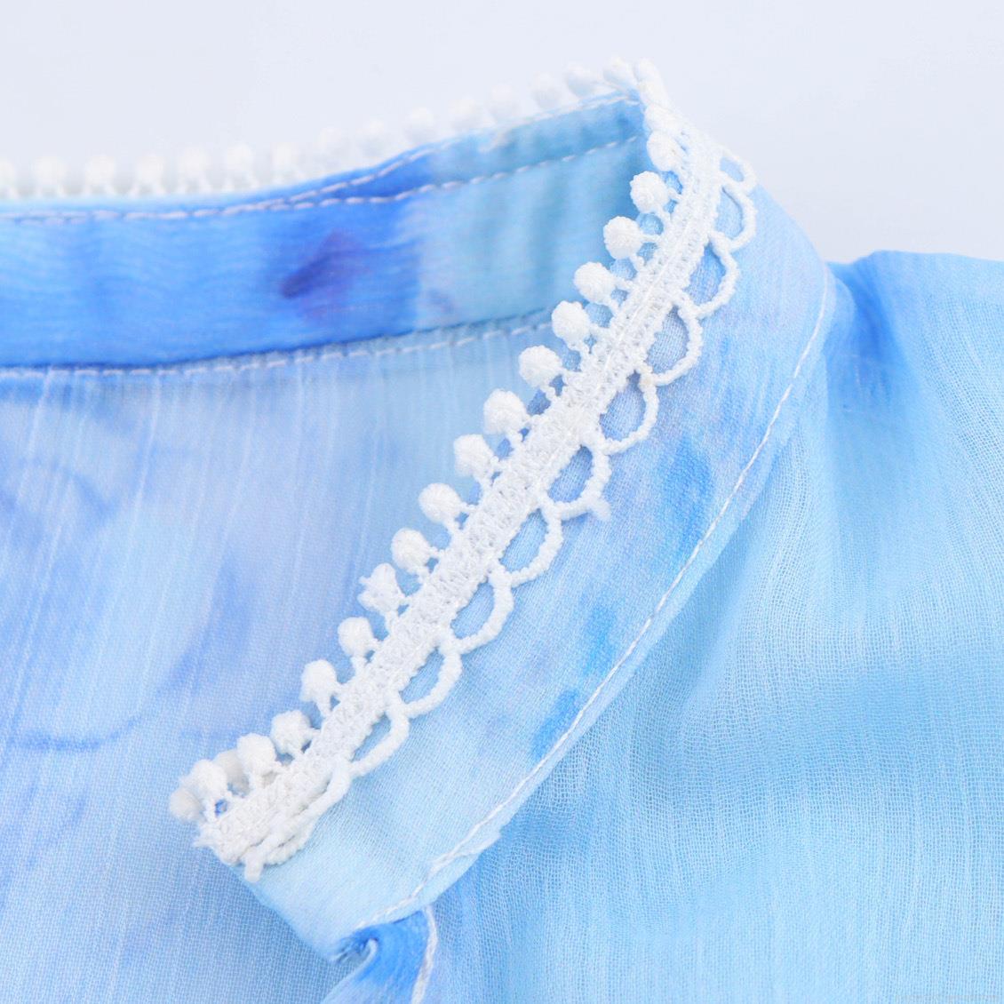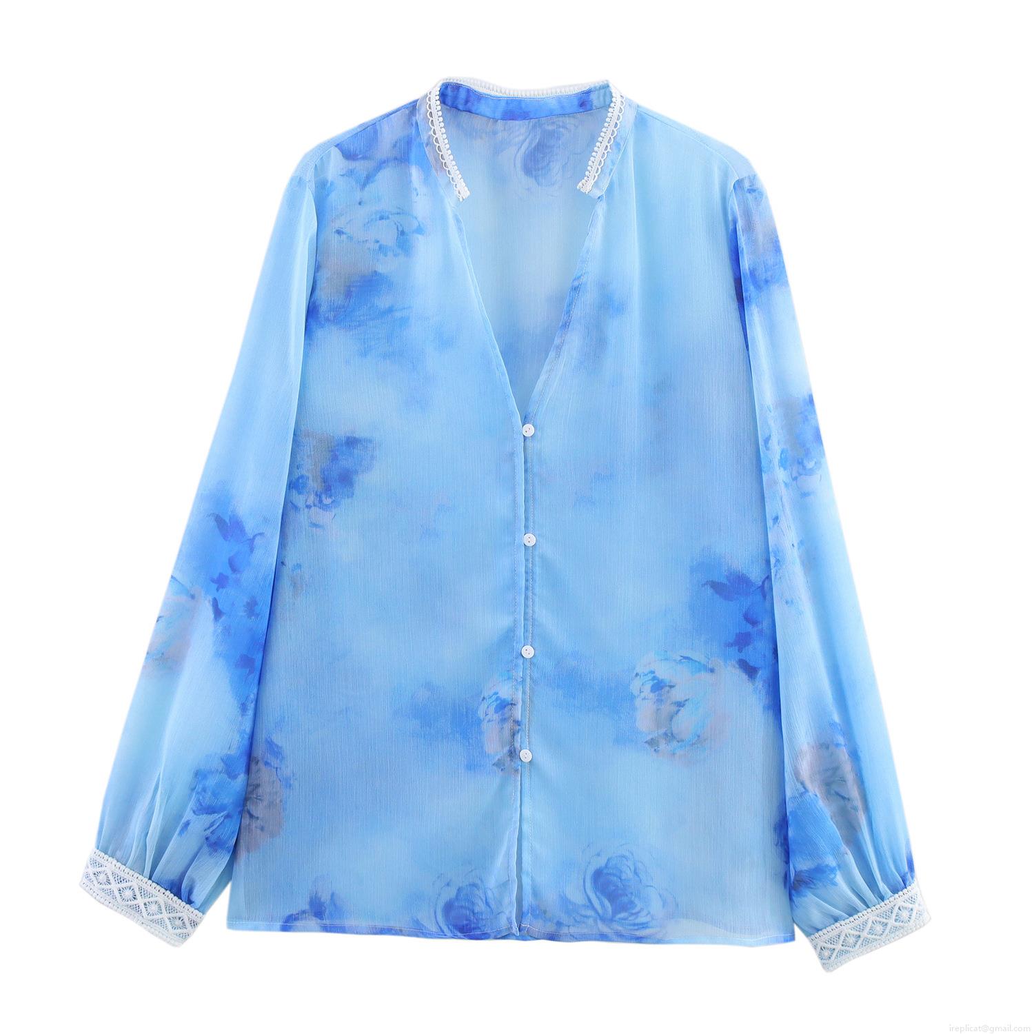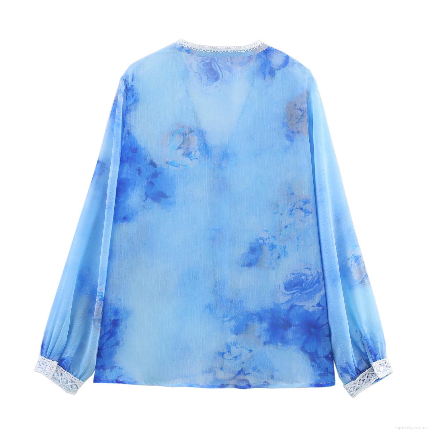 Women's V-Neck Long Sleeve Floral Print Chiffon Blouse With White Lace Trim Loose Casual Holiday Top Polyester Shirt Blue