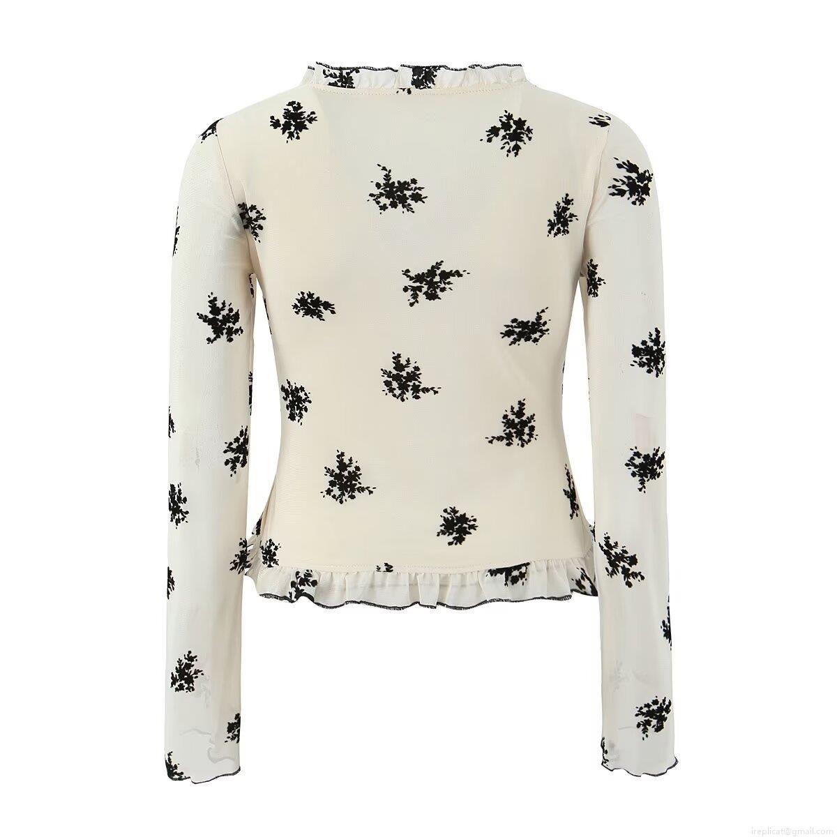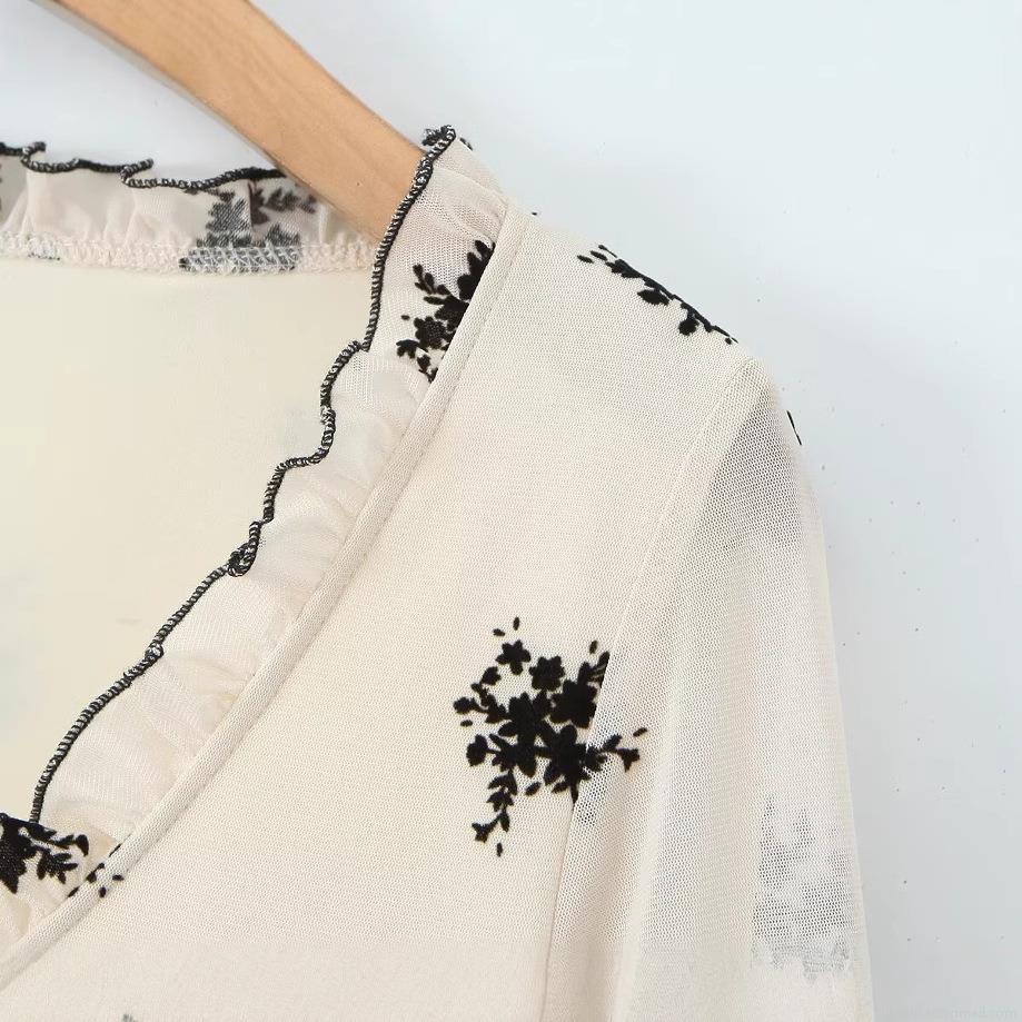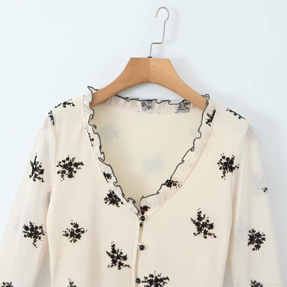 • Women's V-Neck Mesh Floral Cardigan Top With Ruffle Long Sleeve Slim Fit Polyester Spandex Lace Blouse For Daily Dating Street Style Spring Fashion