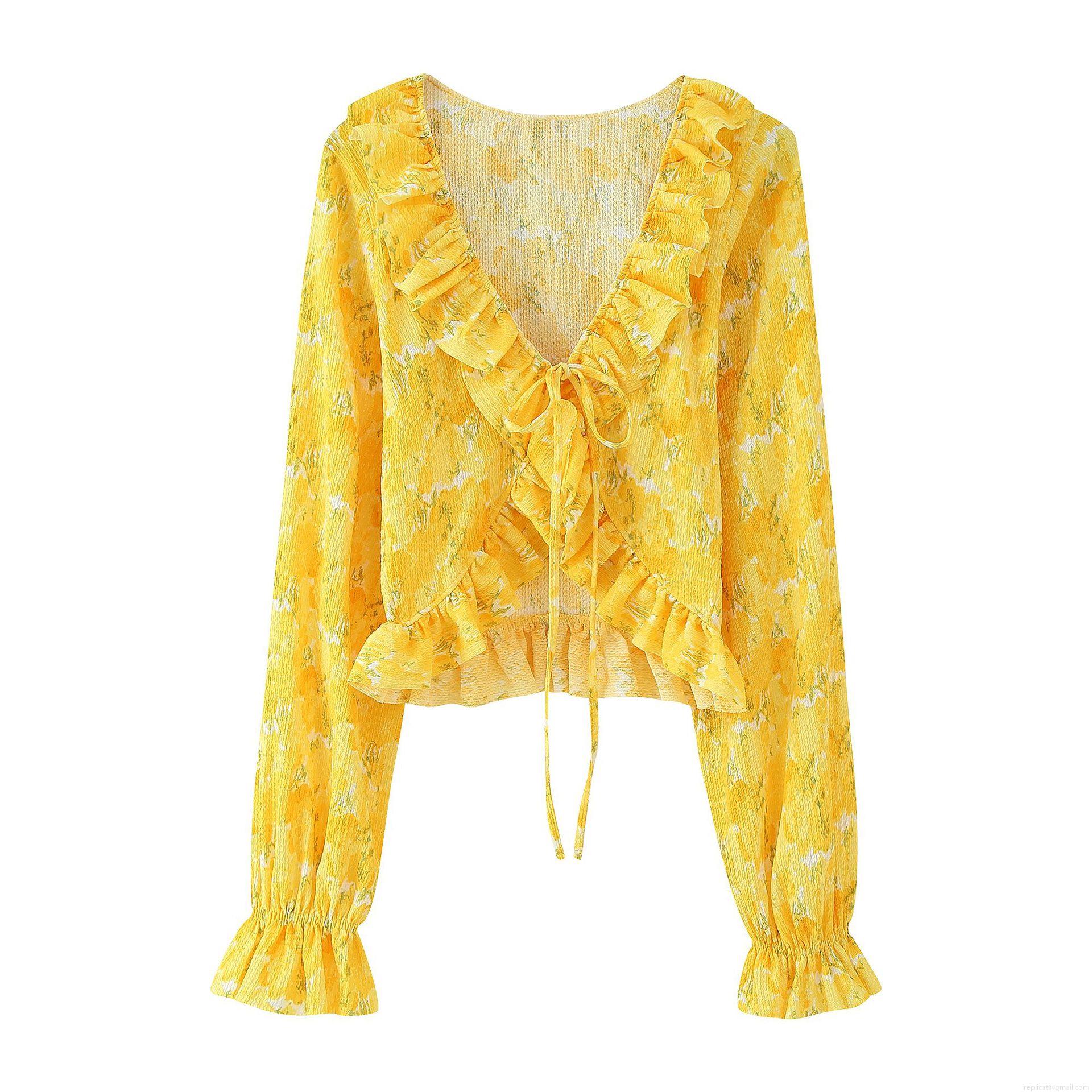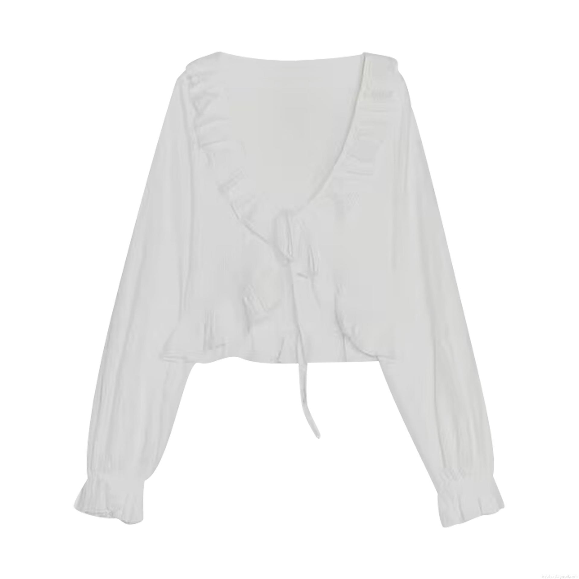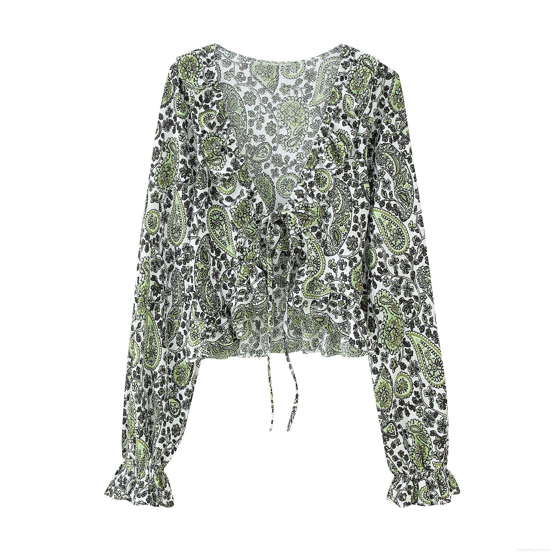 • Women's V-Neck Ruffle Blouse Long Sleeve Tie Front Top Polyester Paisley Floral Solid Color Sweet French Style Shirt Layered Ruffle Trim Casual Party Elegant Streetwear