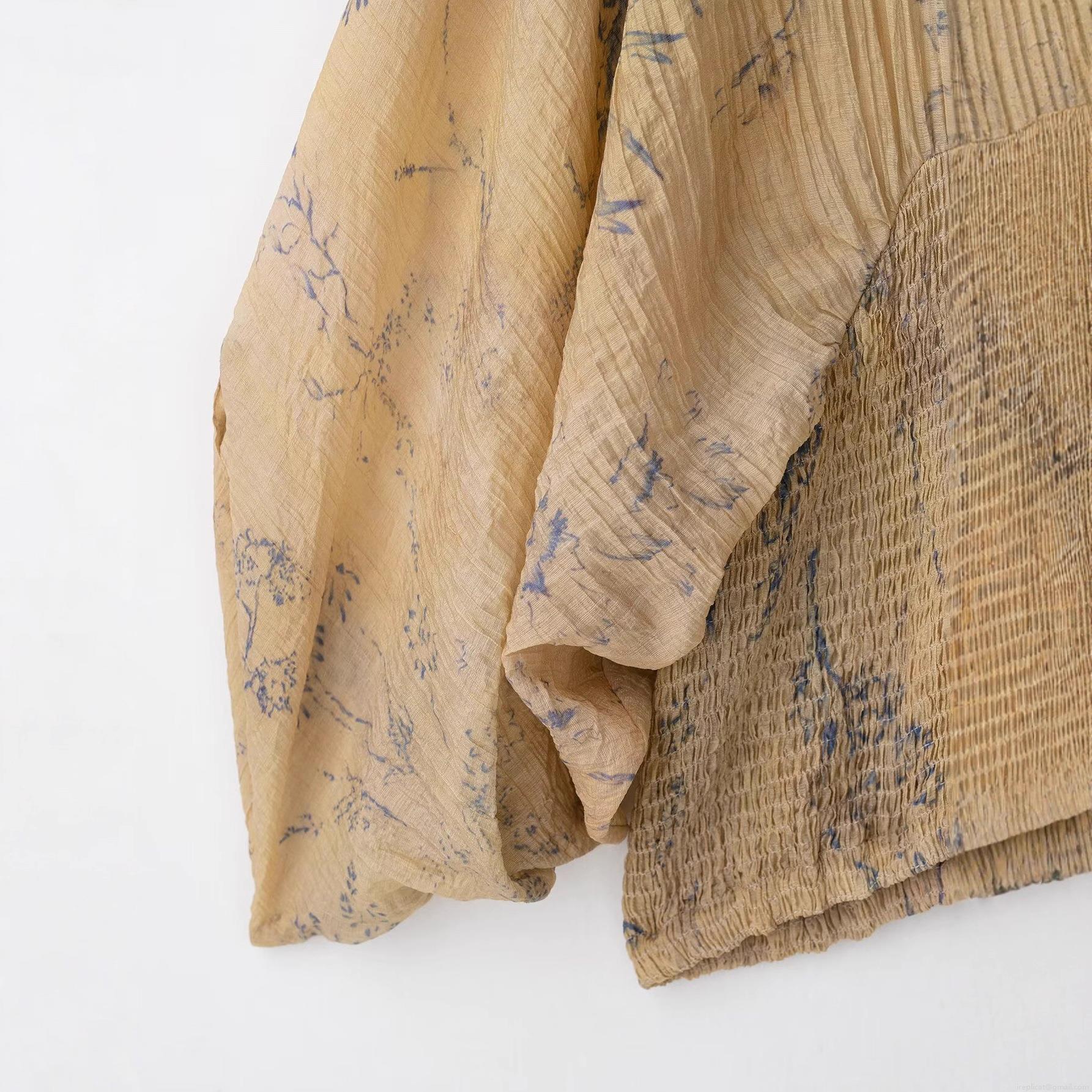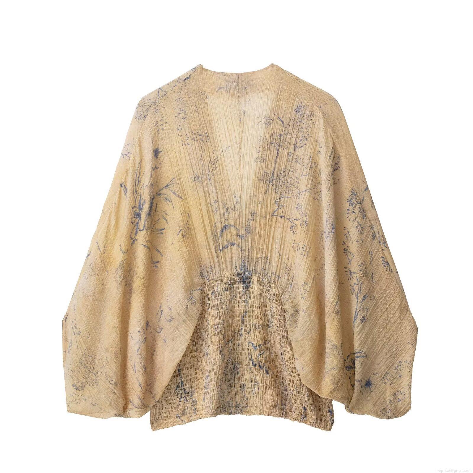 • Women's V-Neck Smocked Waist Floral Printed Blouse Long Raglan Sleeve Pleated Chiffon Top Casual Streetwear Spring Autumn Beige Khaki Shirt