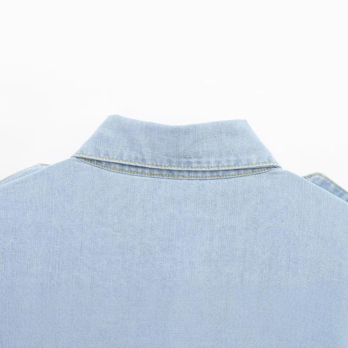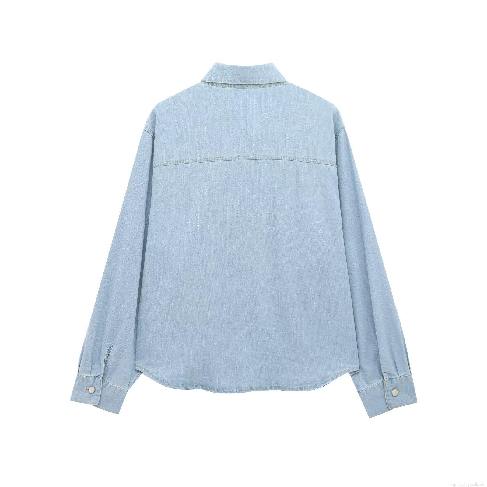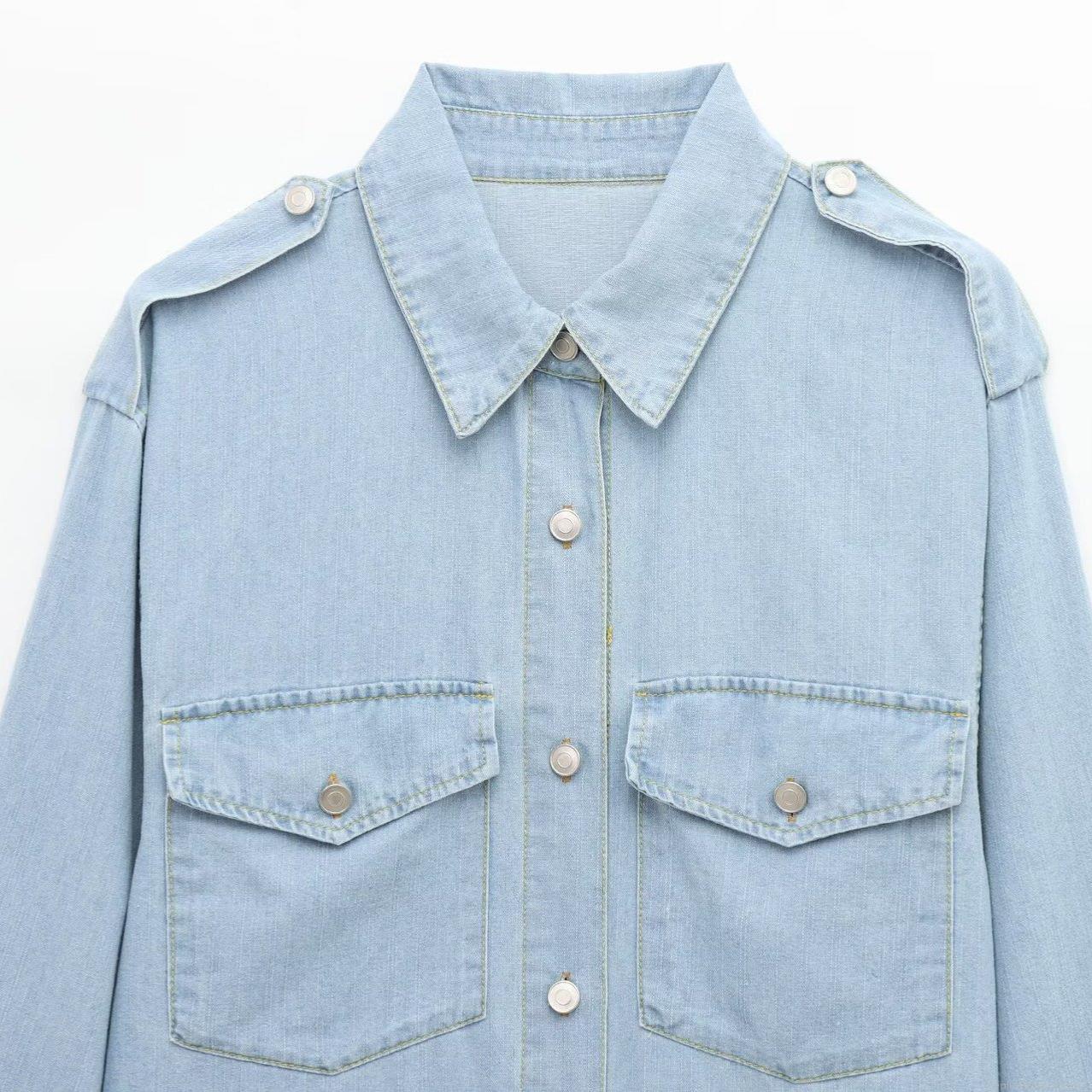 • Women's Western Style Light Blue Denim Shirt Long Sleeve Button Up Lapel Workwear Blouse With Epaulettes And Double Chest Pockets For Spring Autumn Casual Fashion