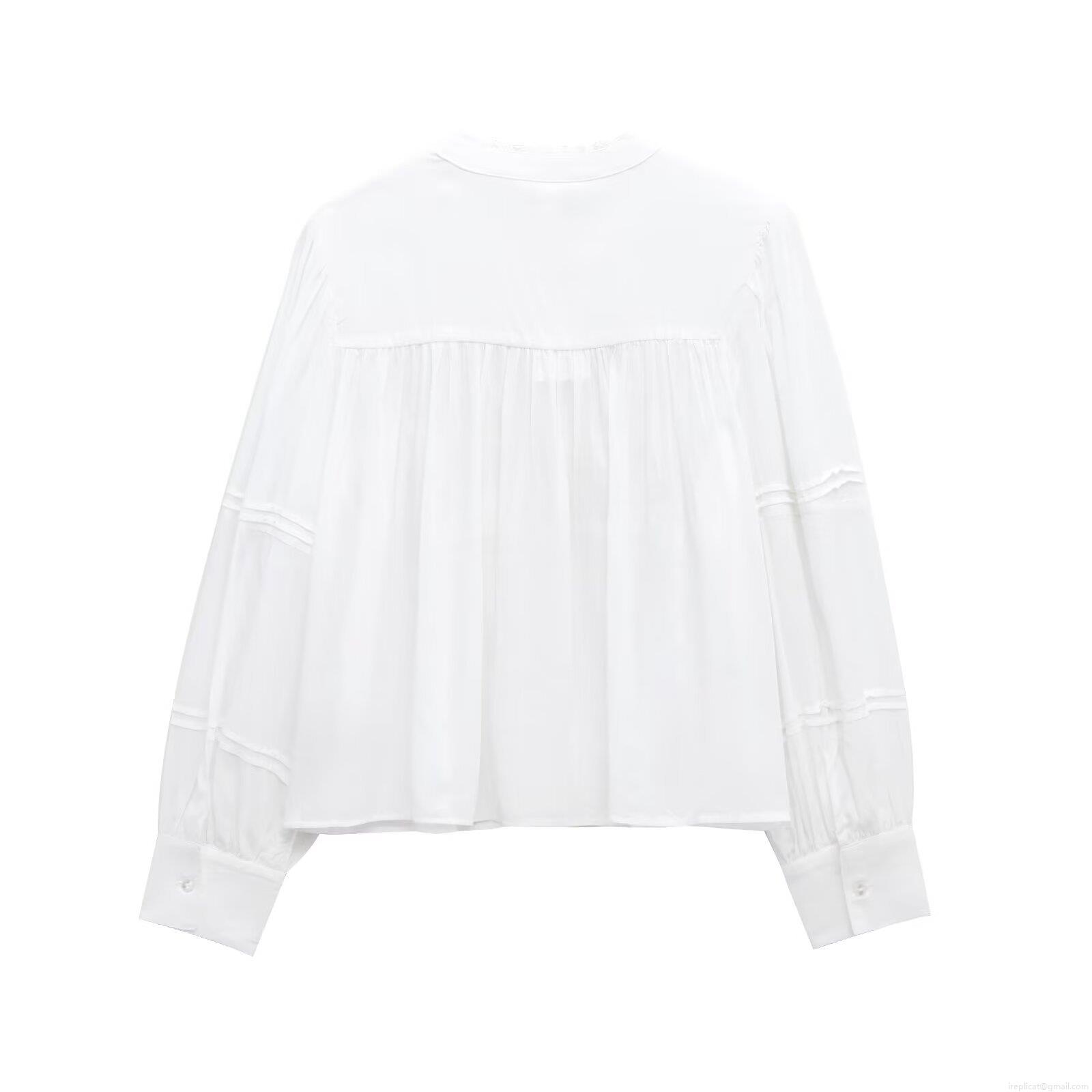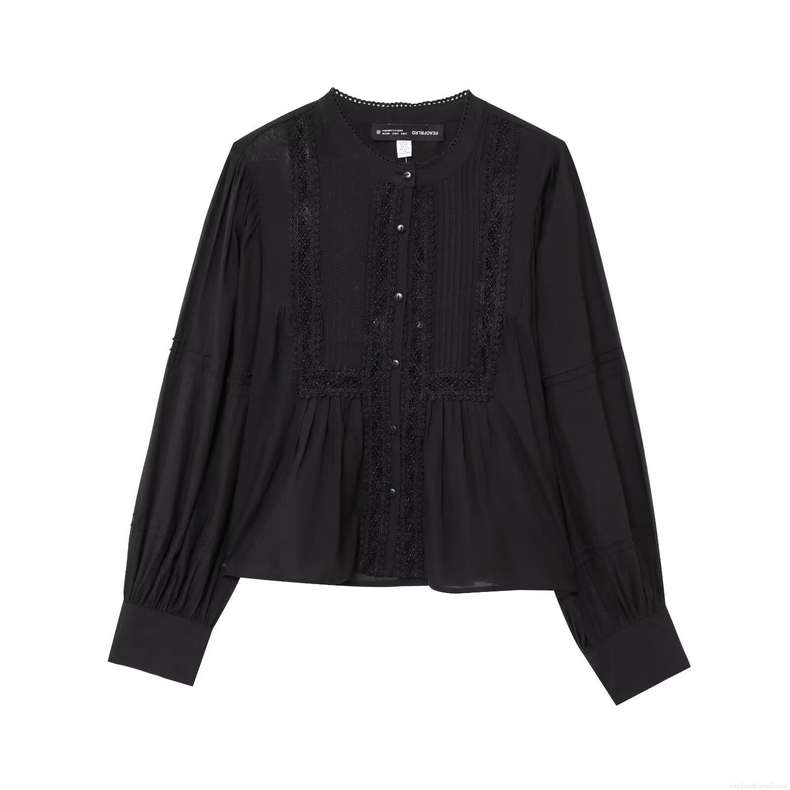 • Women's Western Style Round Neck Solid Color Lace Patchwork Long Sleeve Blouse Elegant Pleated Button Down Shirt For Daily Party Women