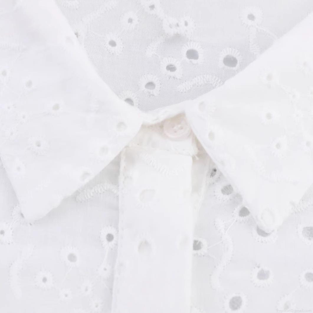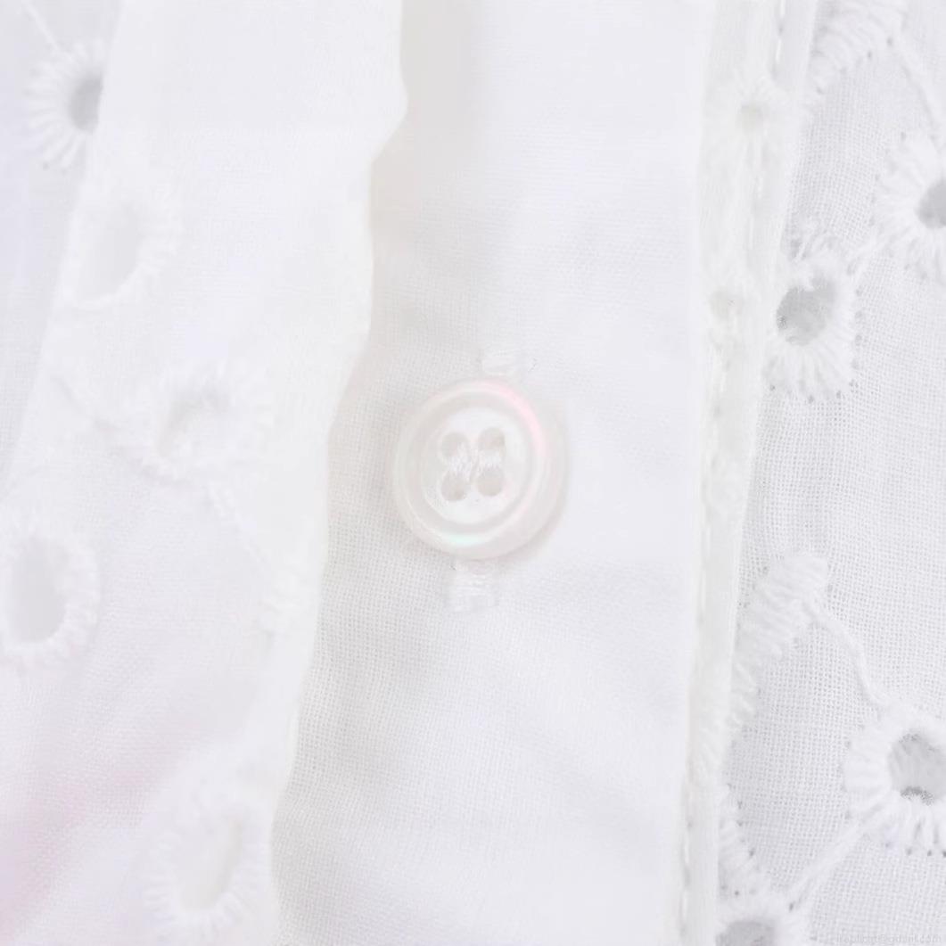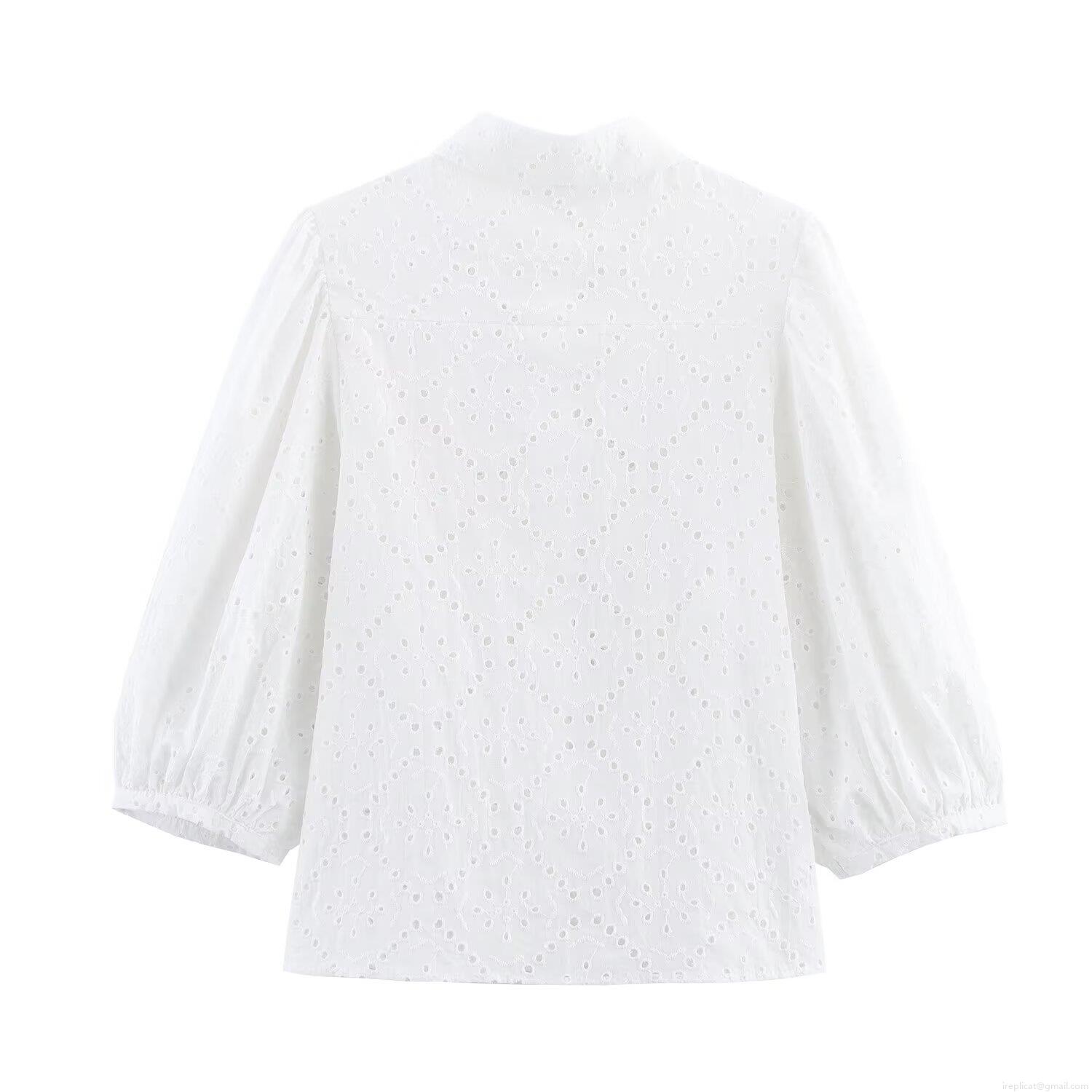 • Women's White Broderie Anglaise Hollow Out Embroidery Shirt Lapel Button Down Cotton Blend 3/4 Sleeve Blouse Casual Summer Top For Women