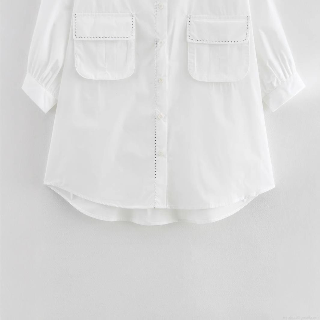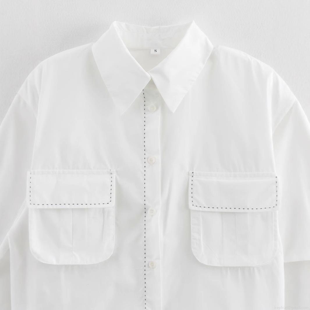 • Women's White Contrast Stitching Short Sleeve Shirt With Double Flap Pockets Casual Workwear Loose Blouse Lady Sweet Woven Top