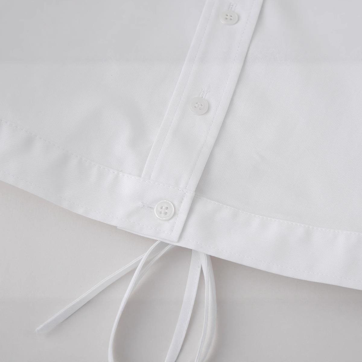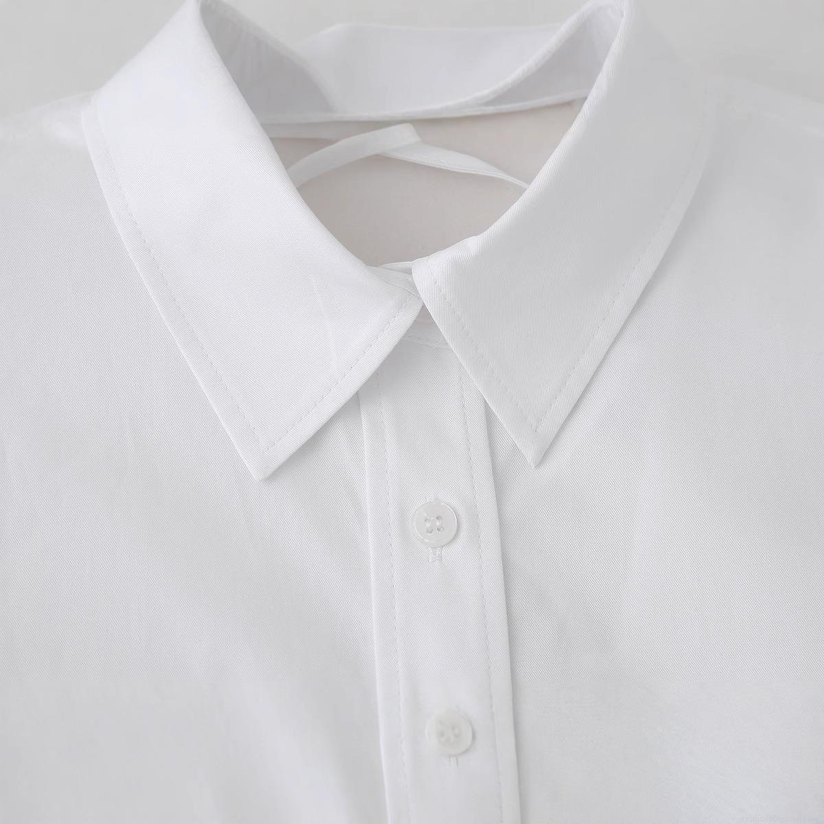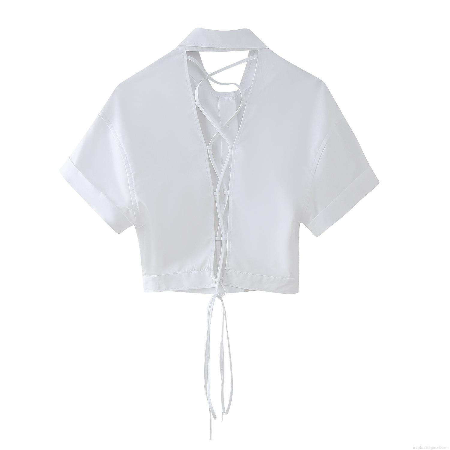 • Women's White Short Sleeve Shirt Polyester Backless Cross Lace-up Drawstring Hem Single Breasted Lapel Crop Top For Summer Daily Fashion