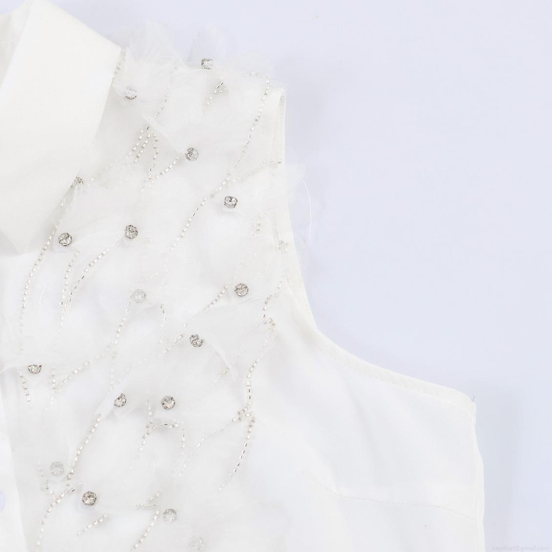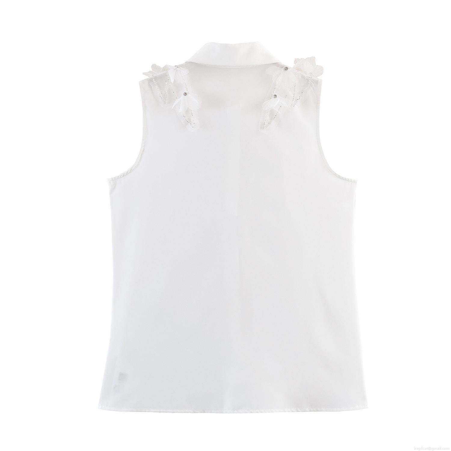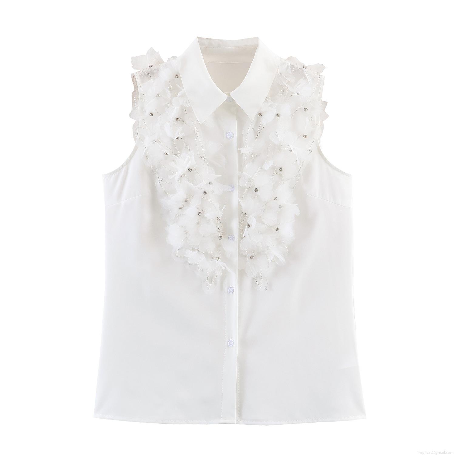 • Women's White Sleeveless Blouse With 3D Floral Applique And Rhinestone Beaded Decoration Elegant Polyester Polo Neck Summer Top For Daily Dating