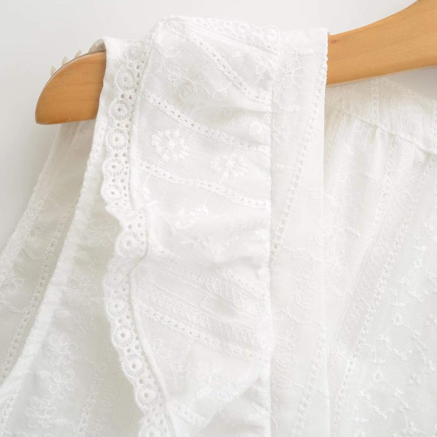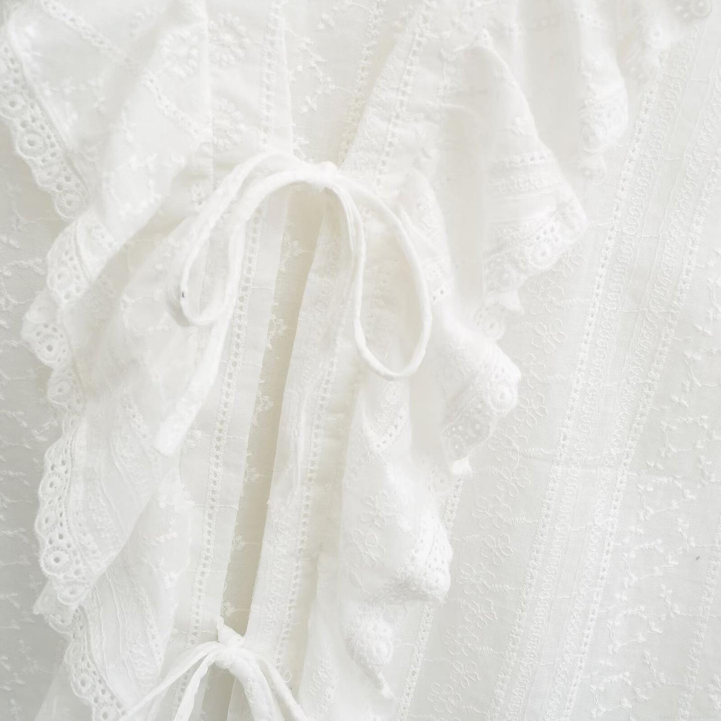 • Women's White Sleeveless V-Neck Embroidery Lace Shirt Elegant Hollow Out Ruffle Tie Front Cotton Blouse Streetwear Casual Summer Top For Women