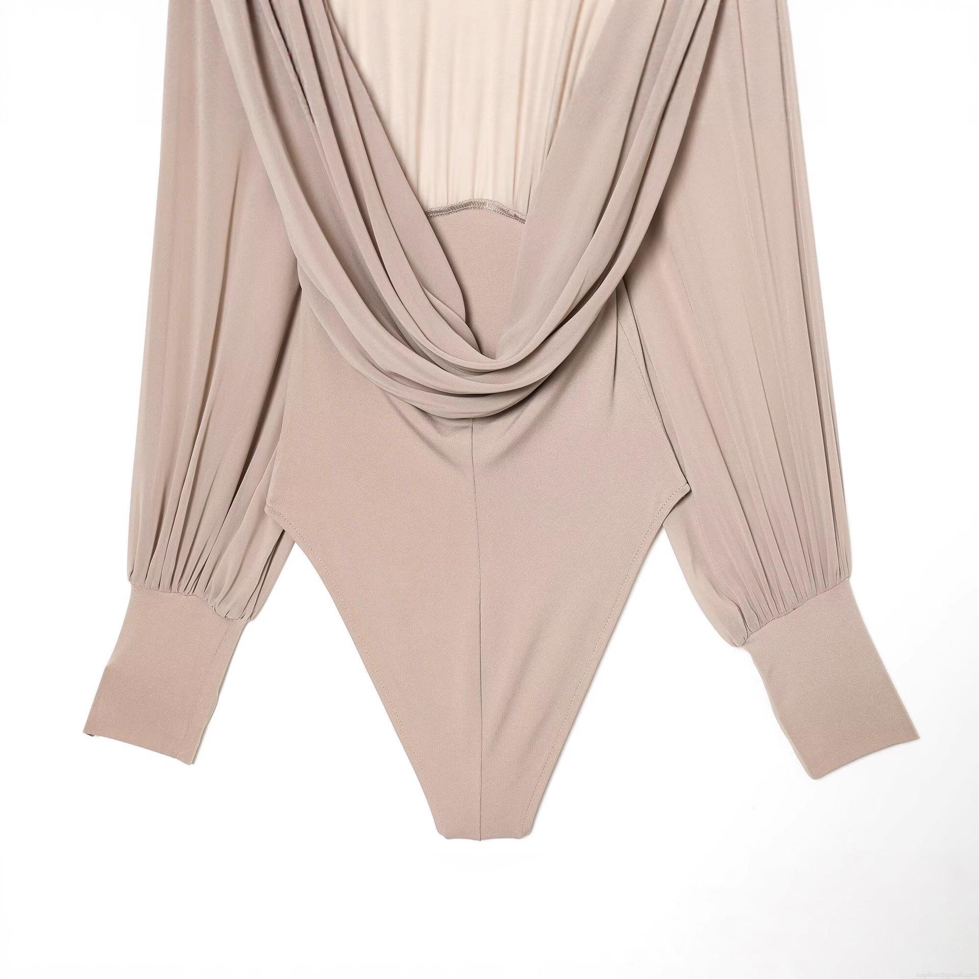 • Sexy Backless Mesh Patchwork Bodysuit Women Half High Neck Long Sleeve Draped Back Slim Fit Leotard Jumpsuit Top Streetwear Party Clubwear