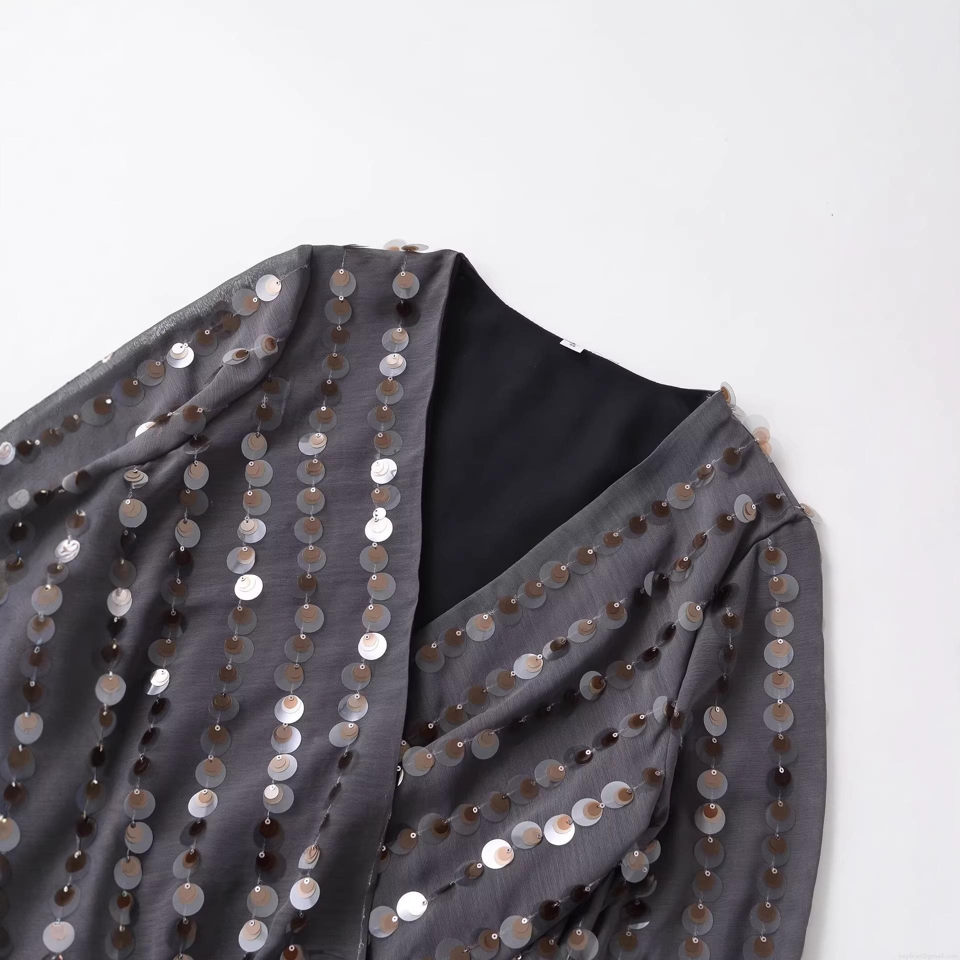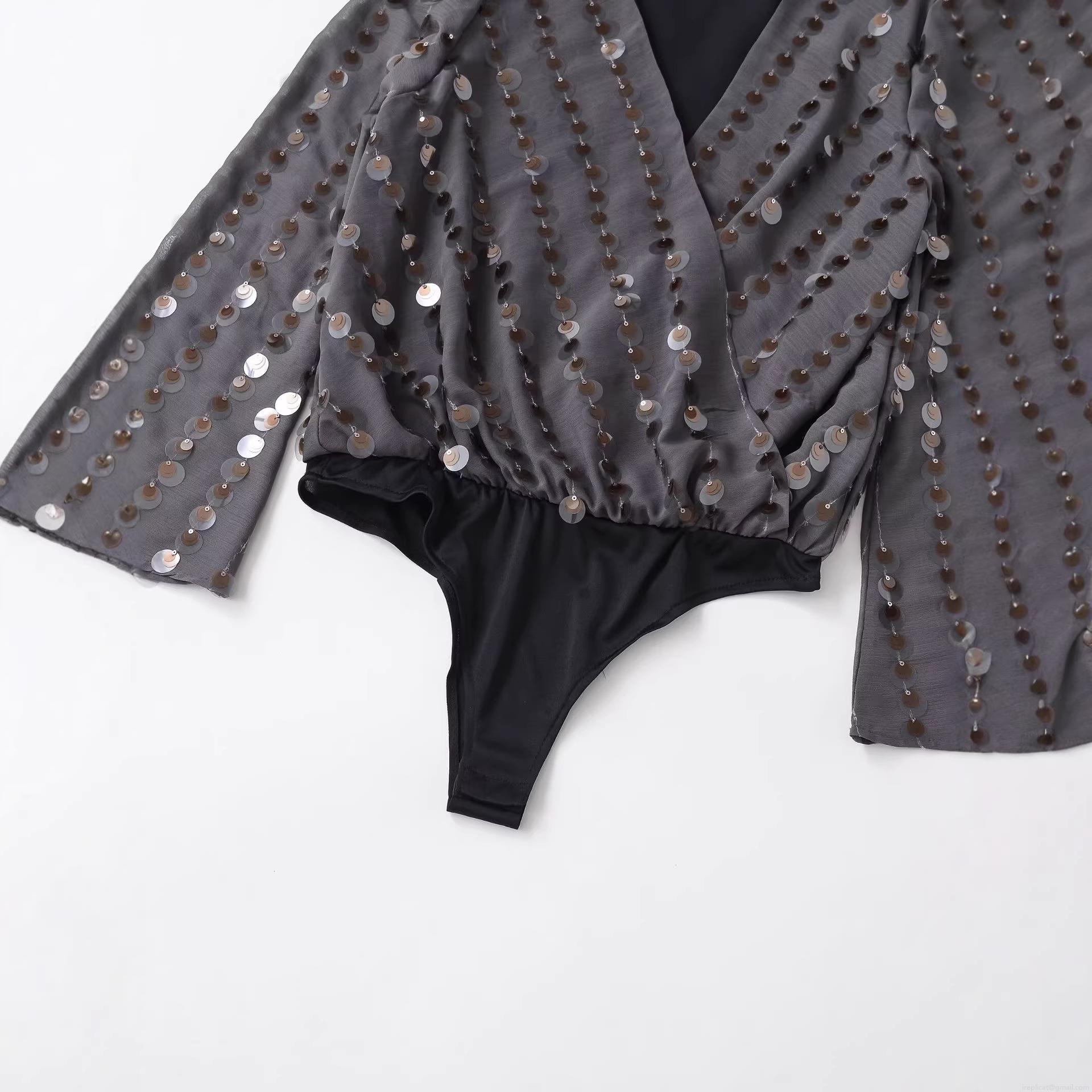 • Sexy V Neck Sequin Bodysuit Women Long Bell Sleeve 100% Polyester Patchwork Jumpsuit For Party Club Street Style Night Out Gray