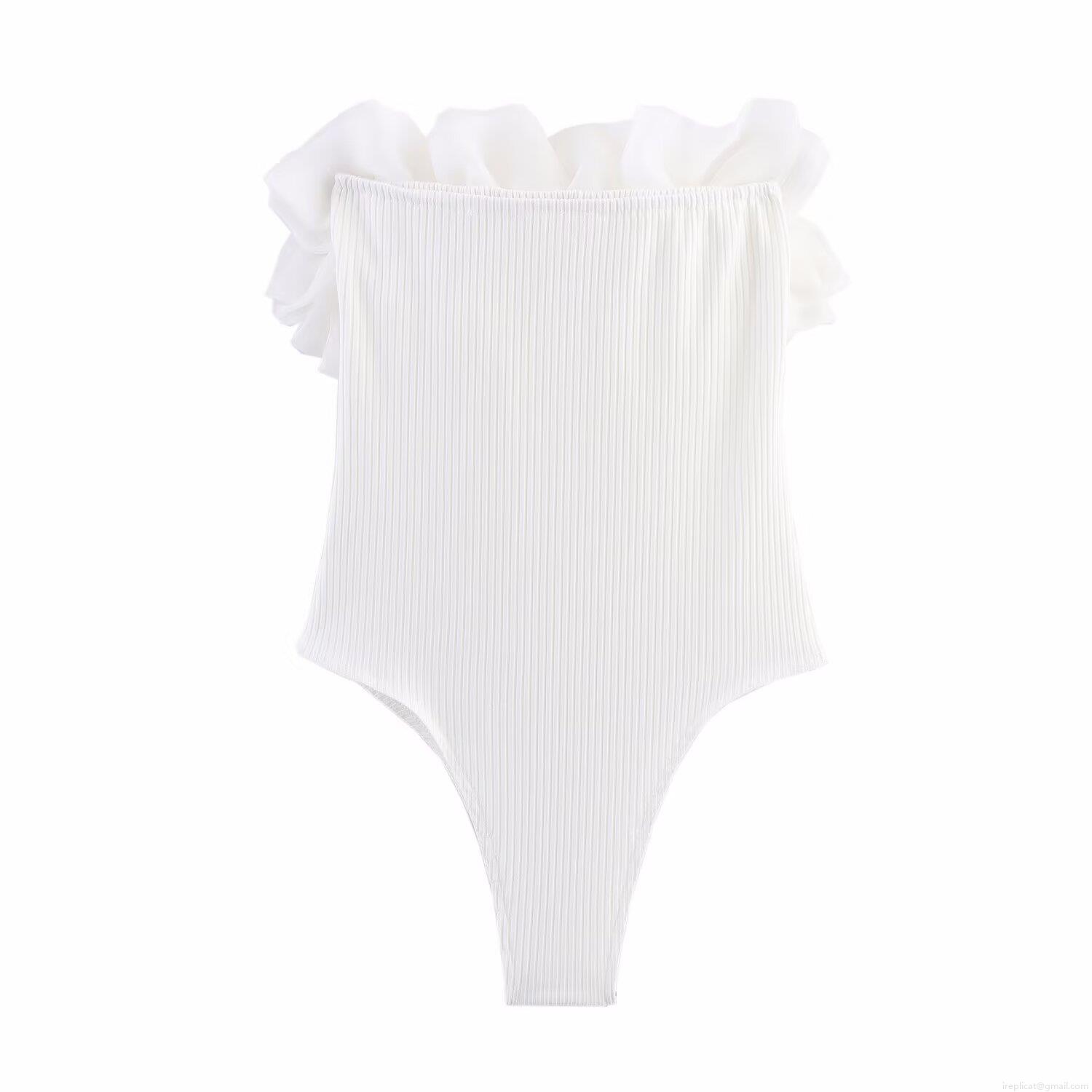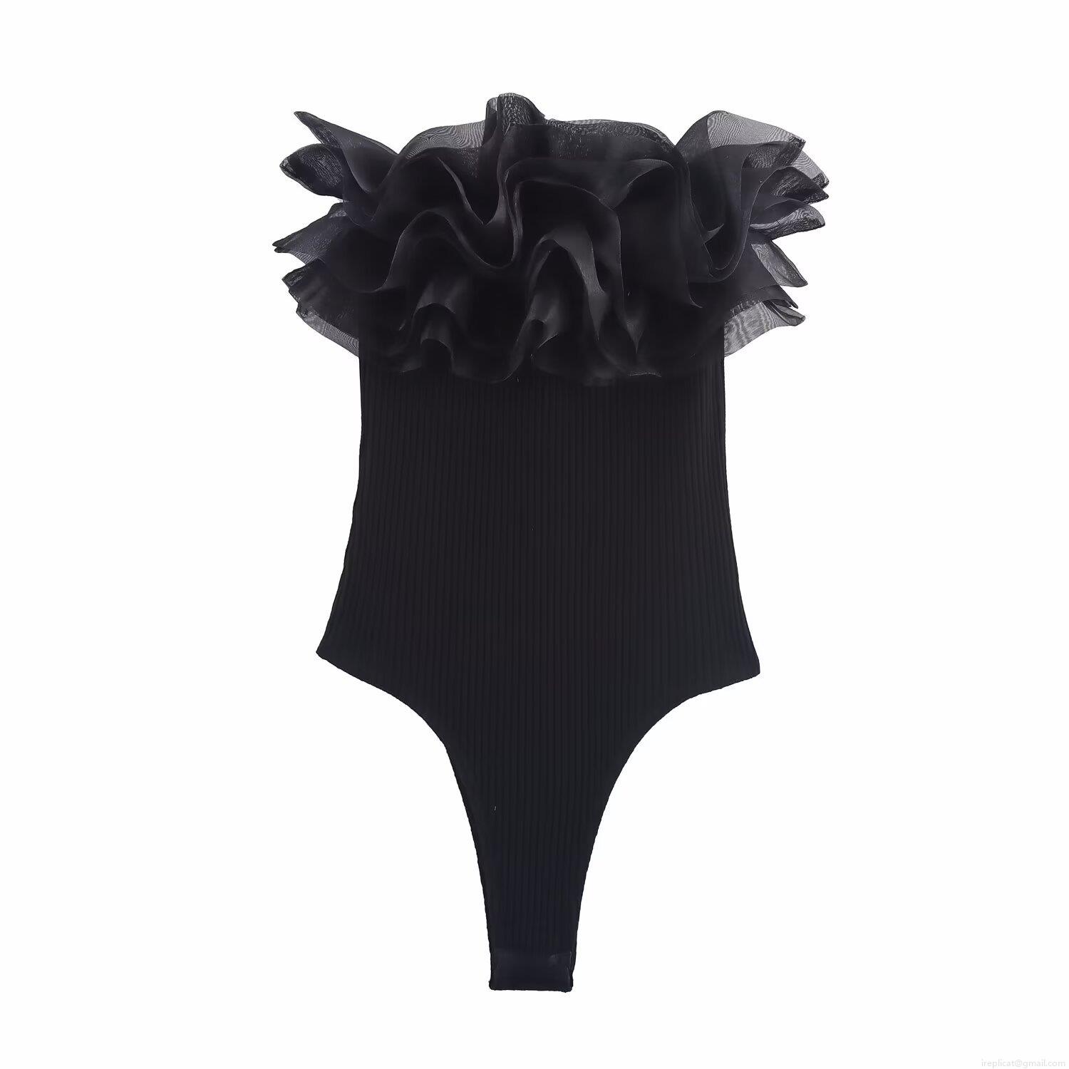 • Sexy Women's Ribbed Bodysuit With Layered Organza Ruffle Trim Sleeveless Slim Fit Jumpsuit For Party Clubwear Sleek Style Solid Color White Black