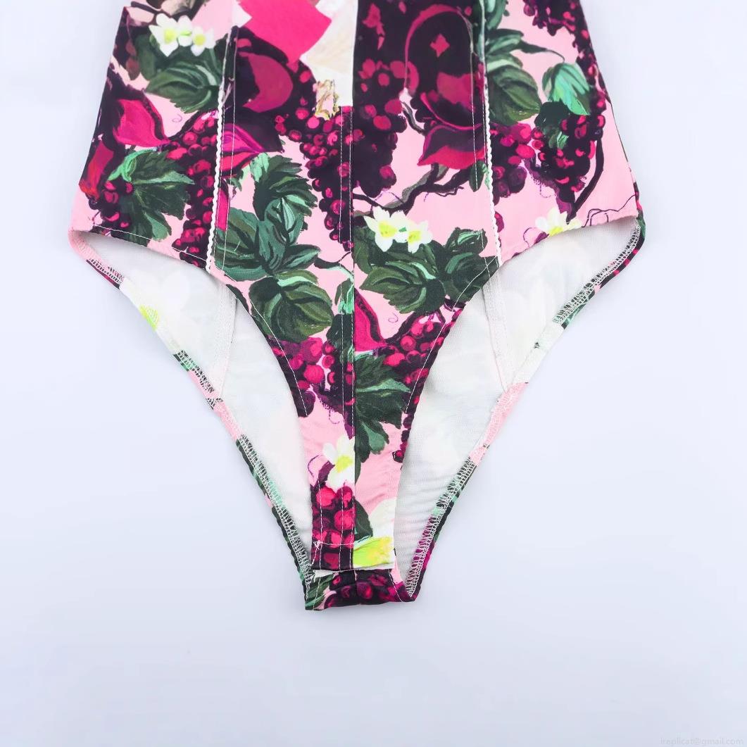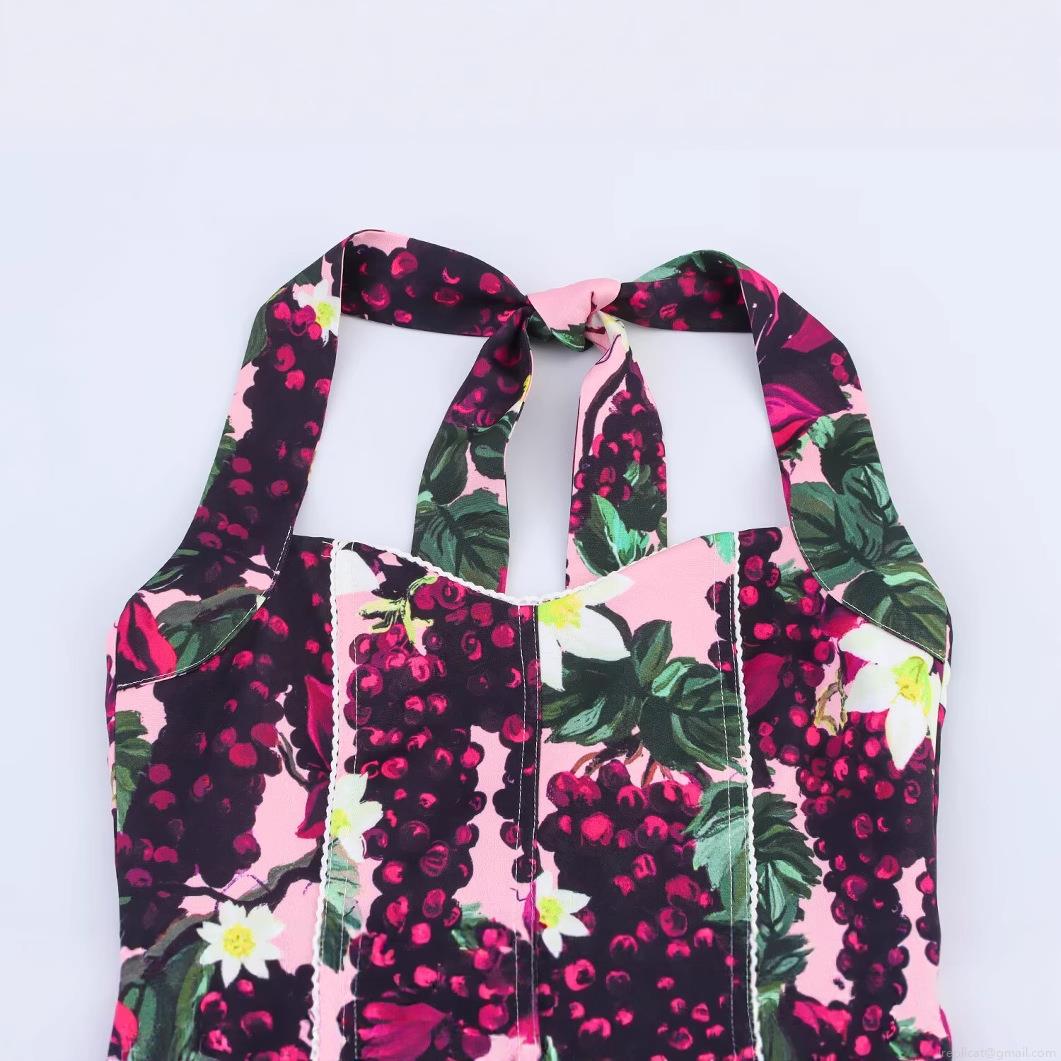 • Women Halter Neck Floral Print Bodysuit Sexy Grape Pattern Sleeveless One-Piece Top Pink Elegant Summer Bodysuits For Women