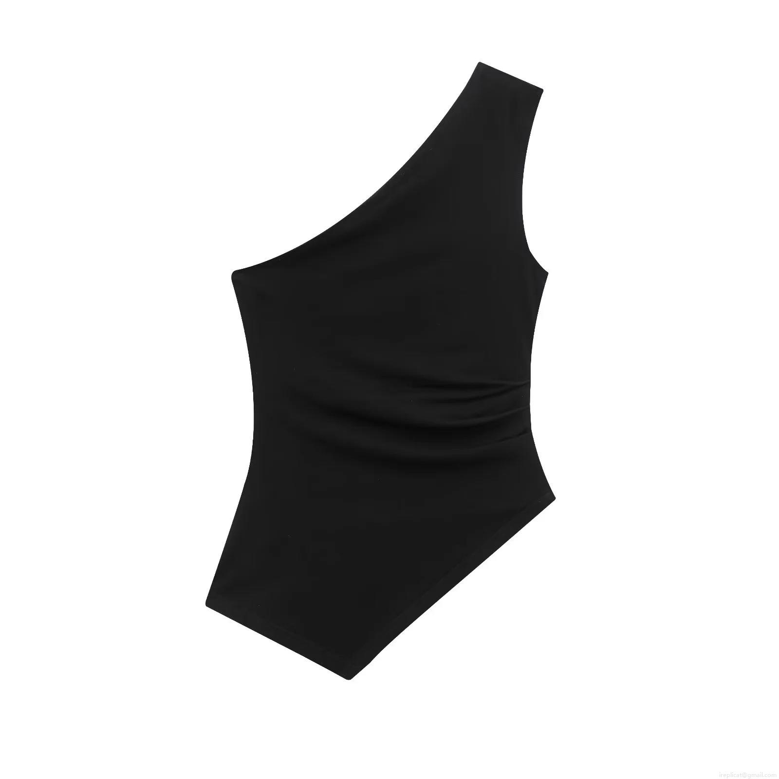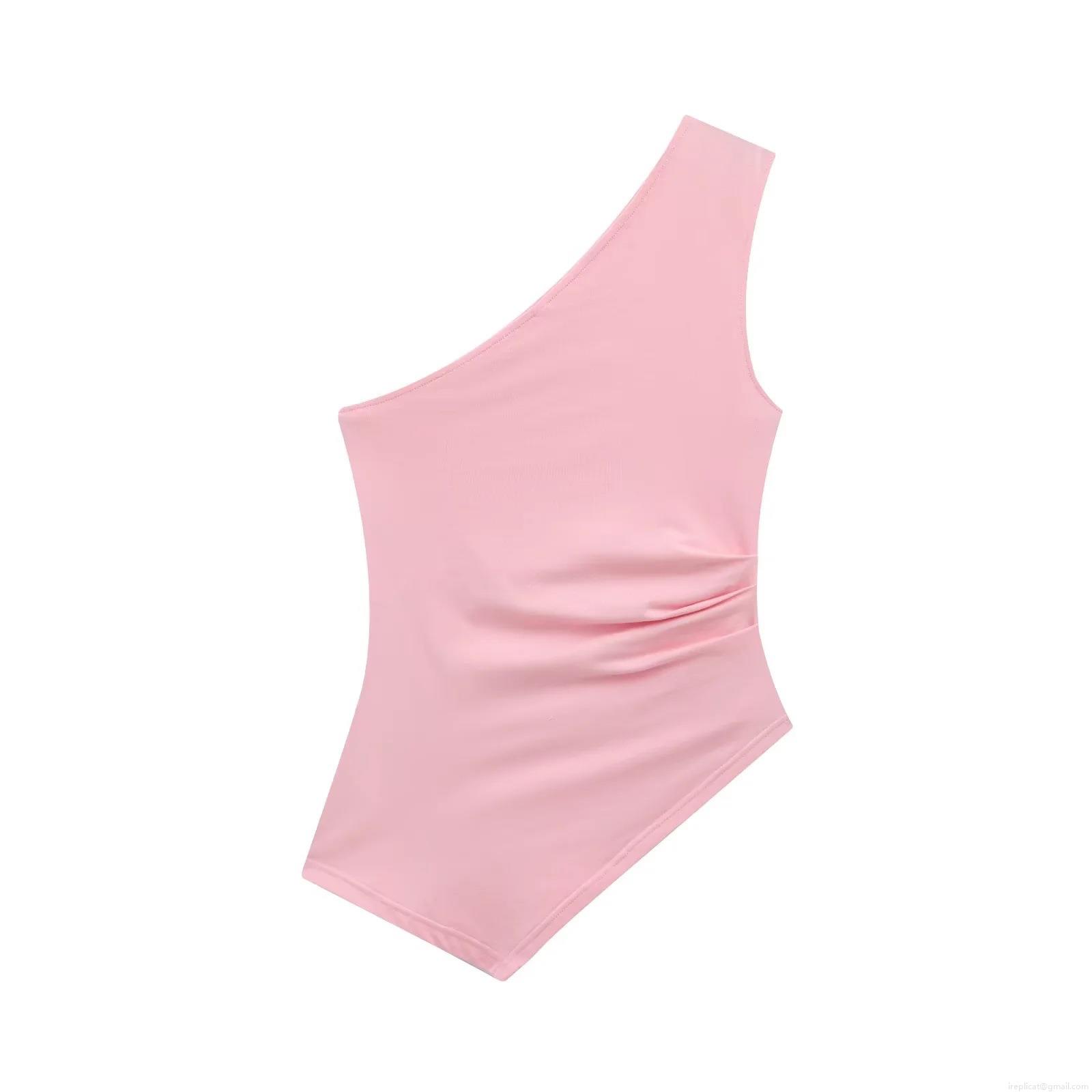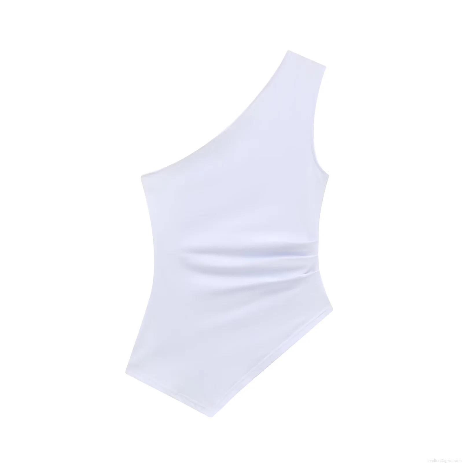 • Women Sexy One Shoulder Ruched Bodysuit Sleeveless Polyester High Elasticity Jumpsuit Top For Party Clubwear Streetwear Casual White Black Pink