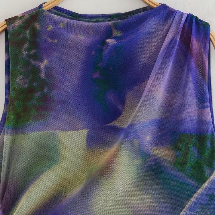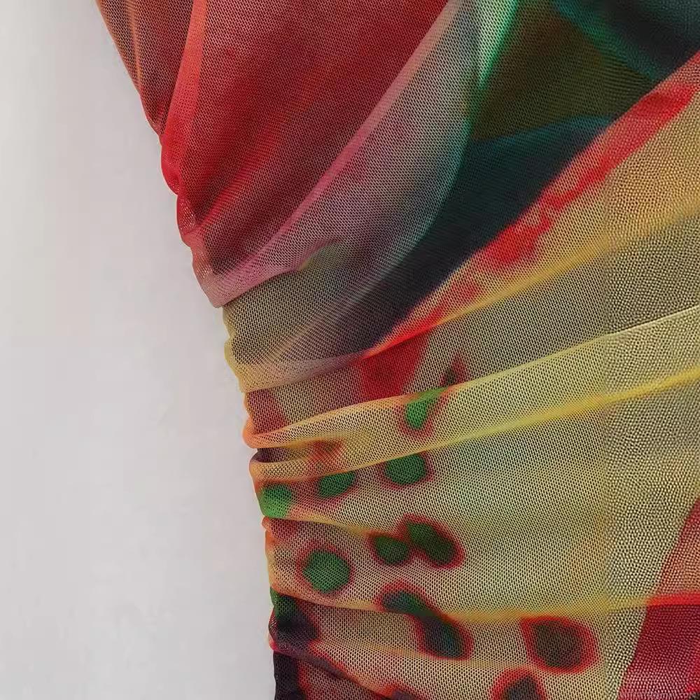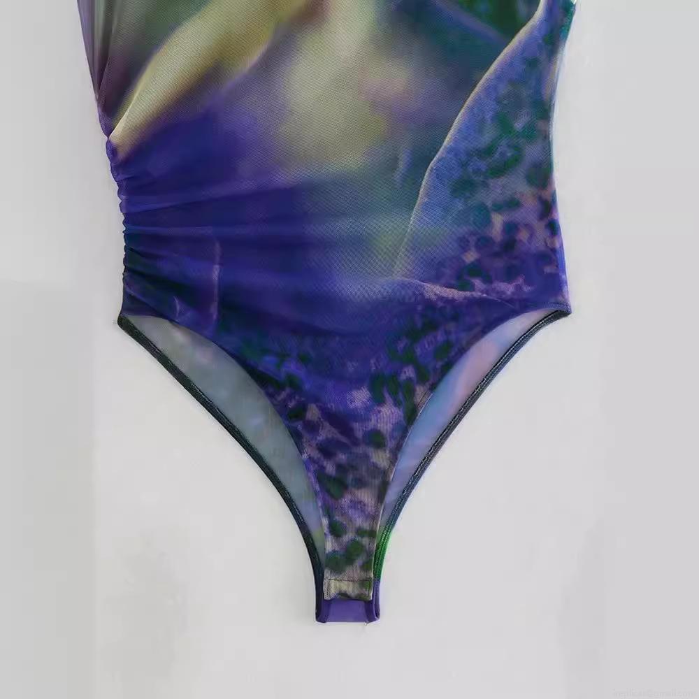 Women Vintage Sleeveless Mesh Bodysuit Abstract Floral Marble Print Ruched Slim Fit One Piece Top For Party Clubwear Streetwear Sexy Body Suits