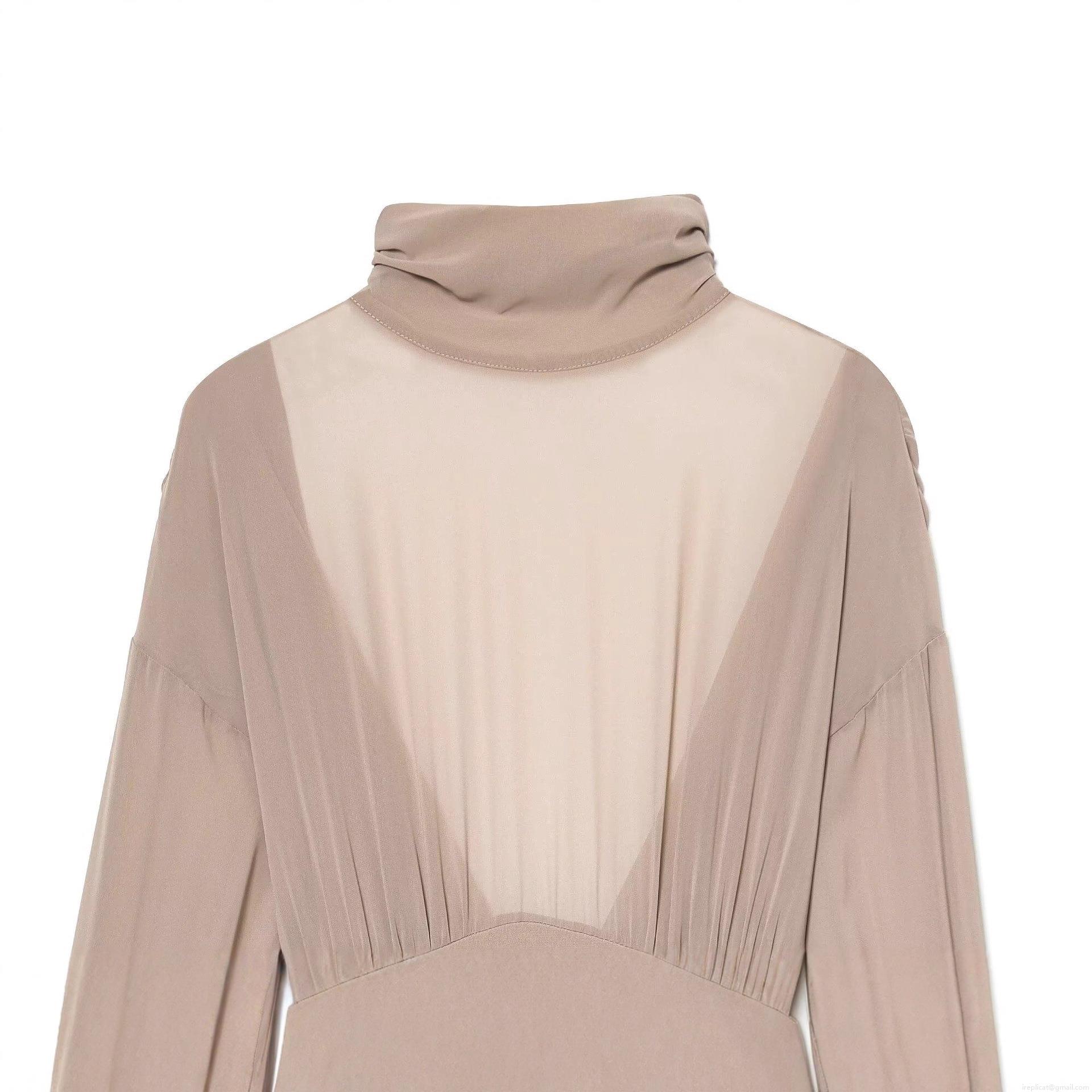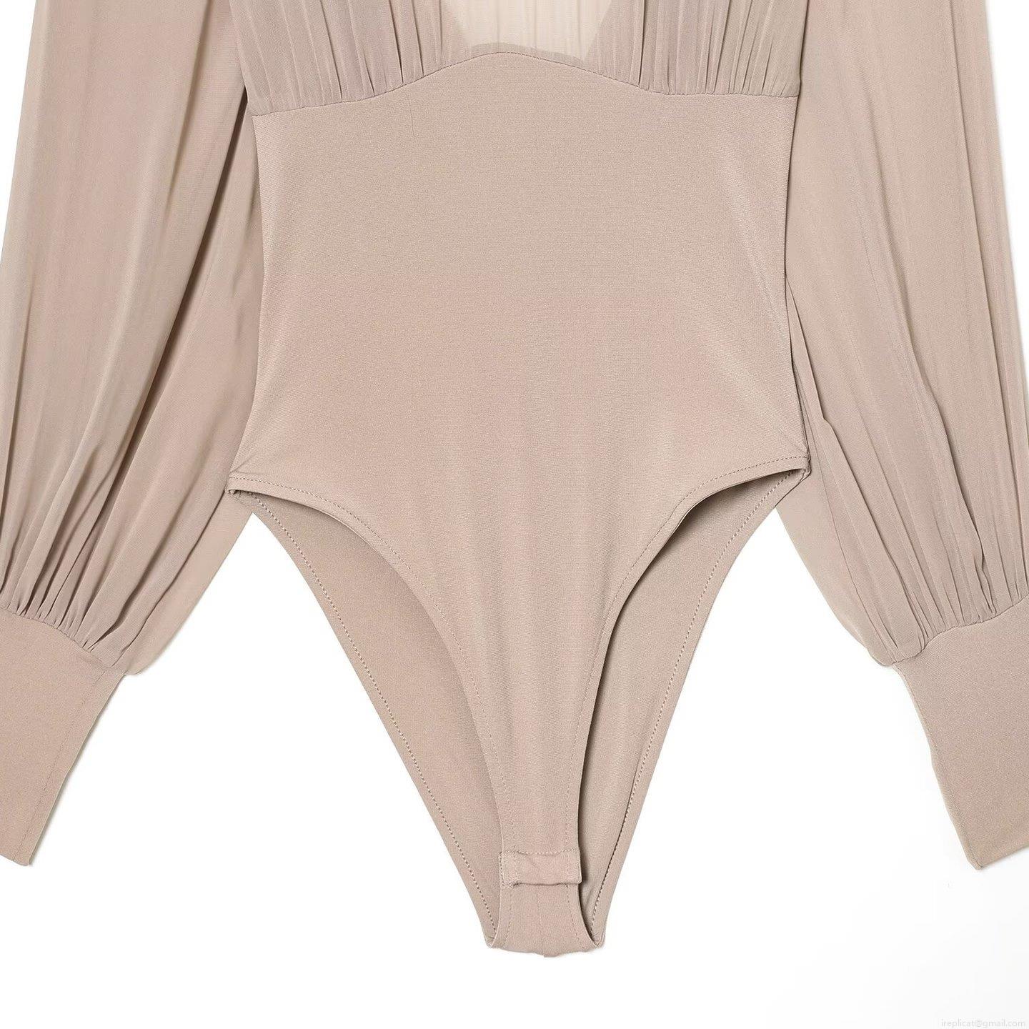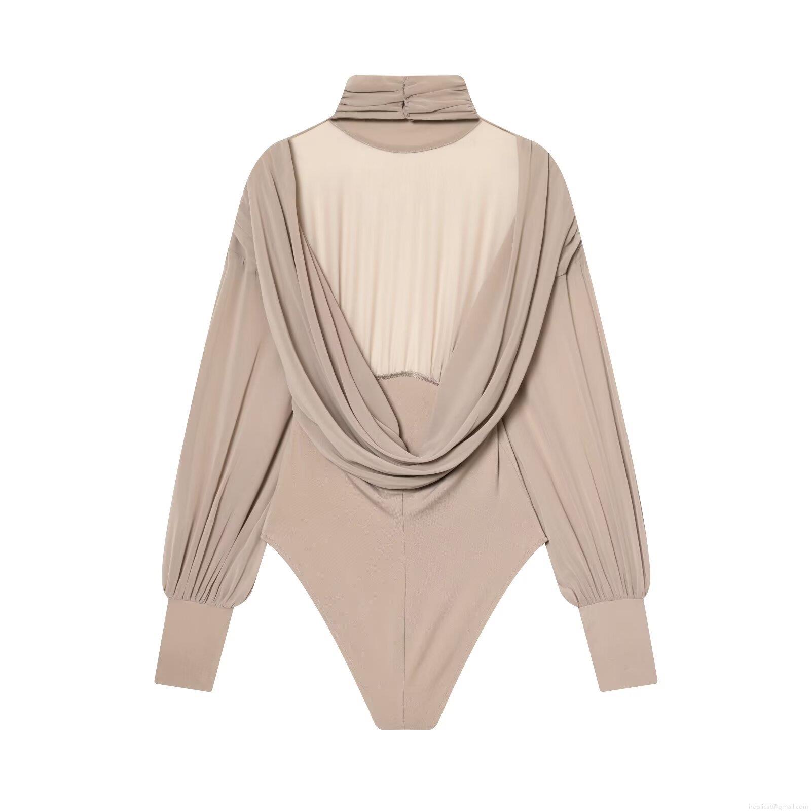 • Women's Elegant High Neck Mesh Patchwork Bodysuit Khaki Long Sleeve Backless Pleated Slim Fit Top Fashion Bodycon Party Jumpsuit Leotard