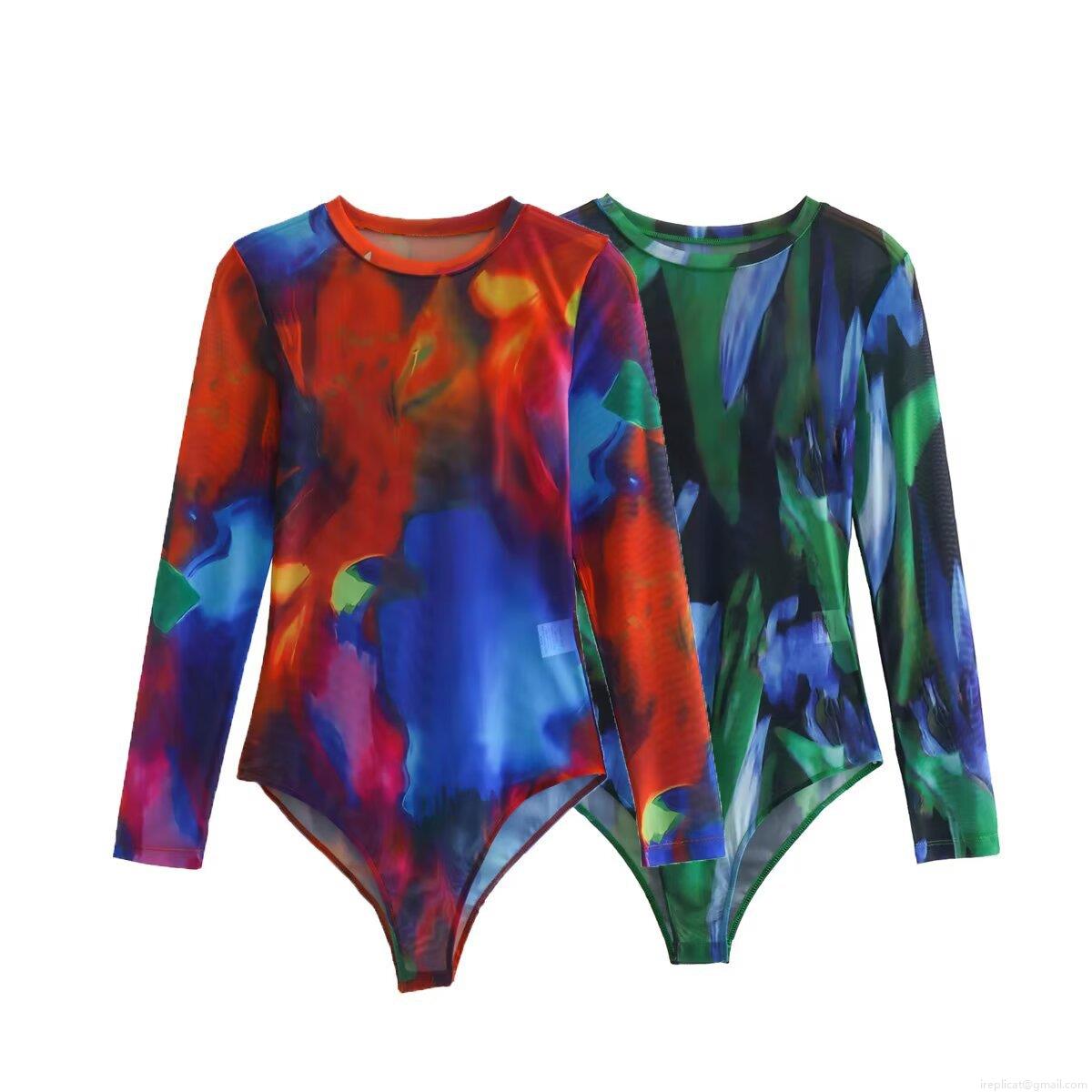 • Women's Sexy Abstract Art Print Long Sleeve Mesh Bodysuit Elegant Slim Fit Round Neck See-Through Jumpsuit Top For Summer Party Vacation