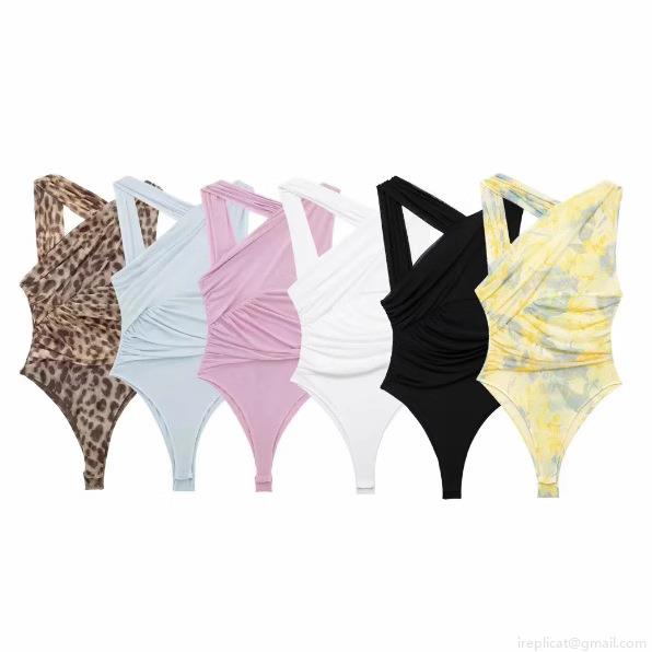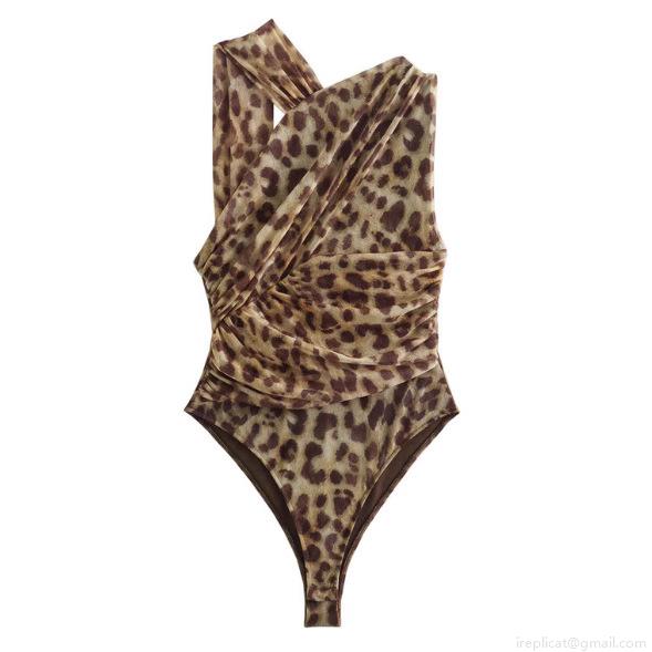 Solid Color, Leopard Print, Floral Pattern, Pleats, Neckband, Silk Net, Asymmetrical Cut, Crossover Collar