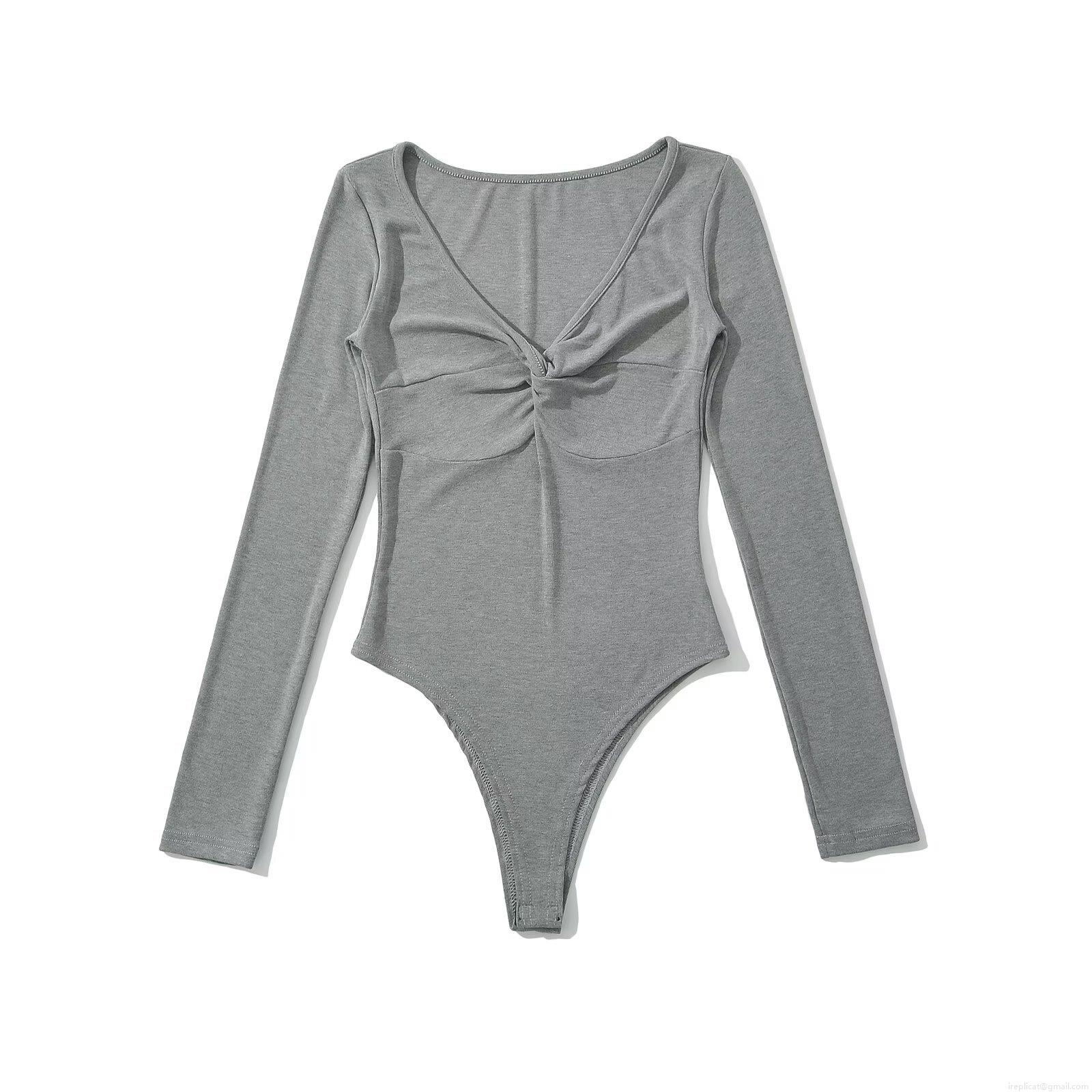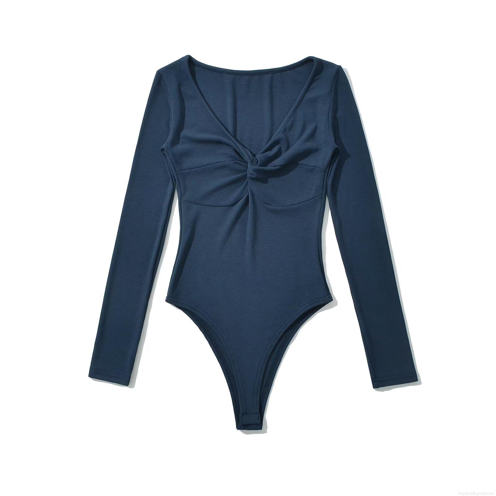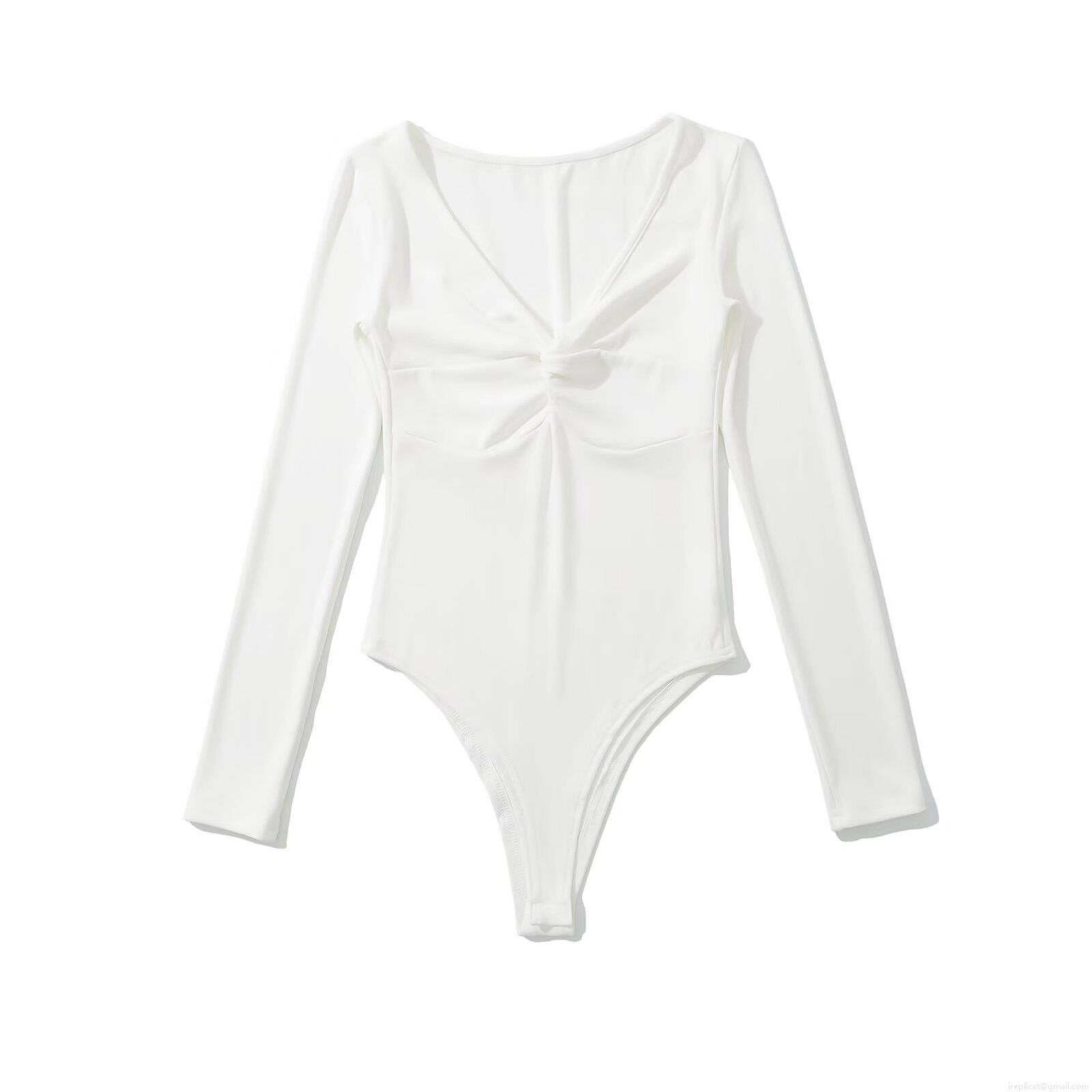 • Women's Sexy Deep V Neck Long Sleeve Bodysuit With Twist Front Knotted Design Slim Fit Solid Color Polyester Ribbed Knit Jumpsuit Romper For Clubwear Party Casual Tops