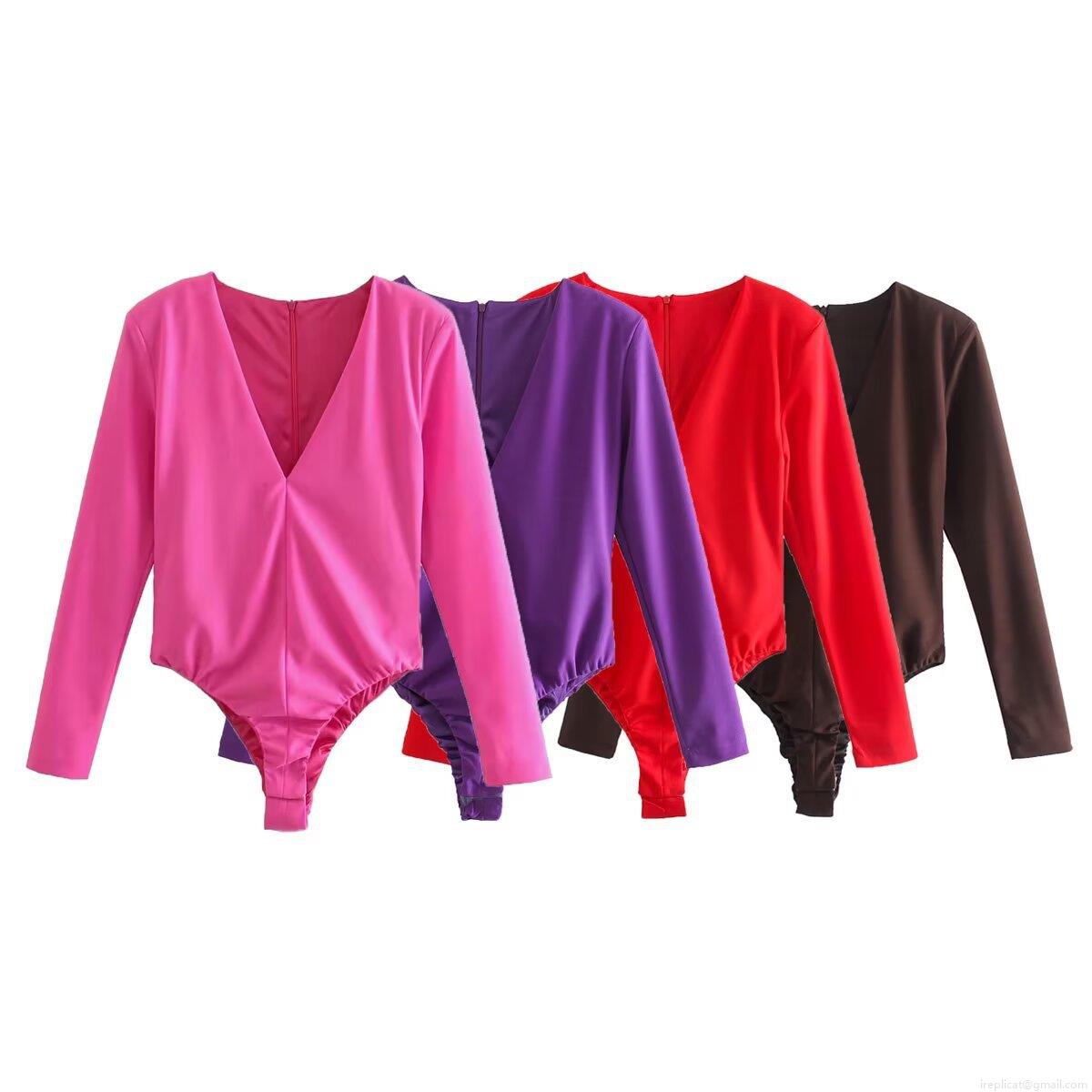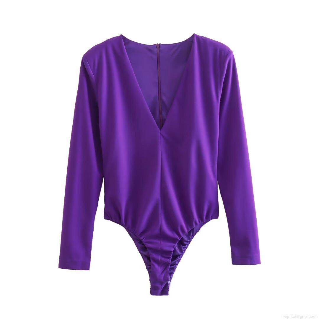 • Women's Sexy Deep V-Neck Long Sleeve Bodysuit Elegant Solid Color Shoulder Pad Tight Fit Jumpsuit With Back Zipper For Party Nightclub Daily Clubwear