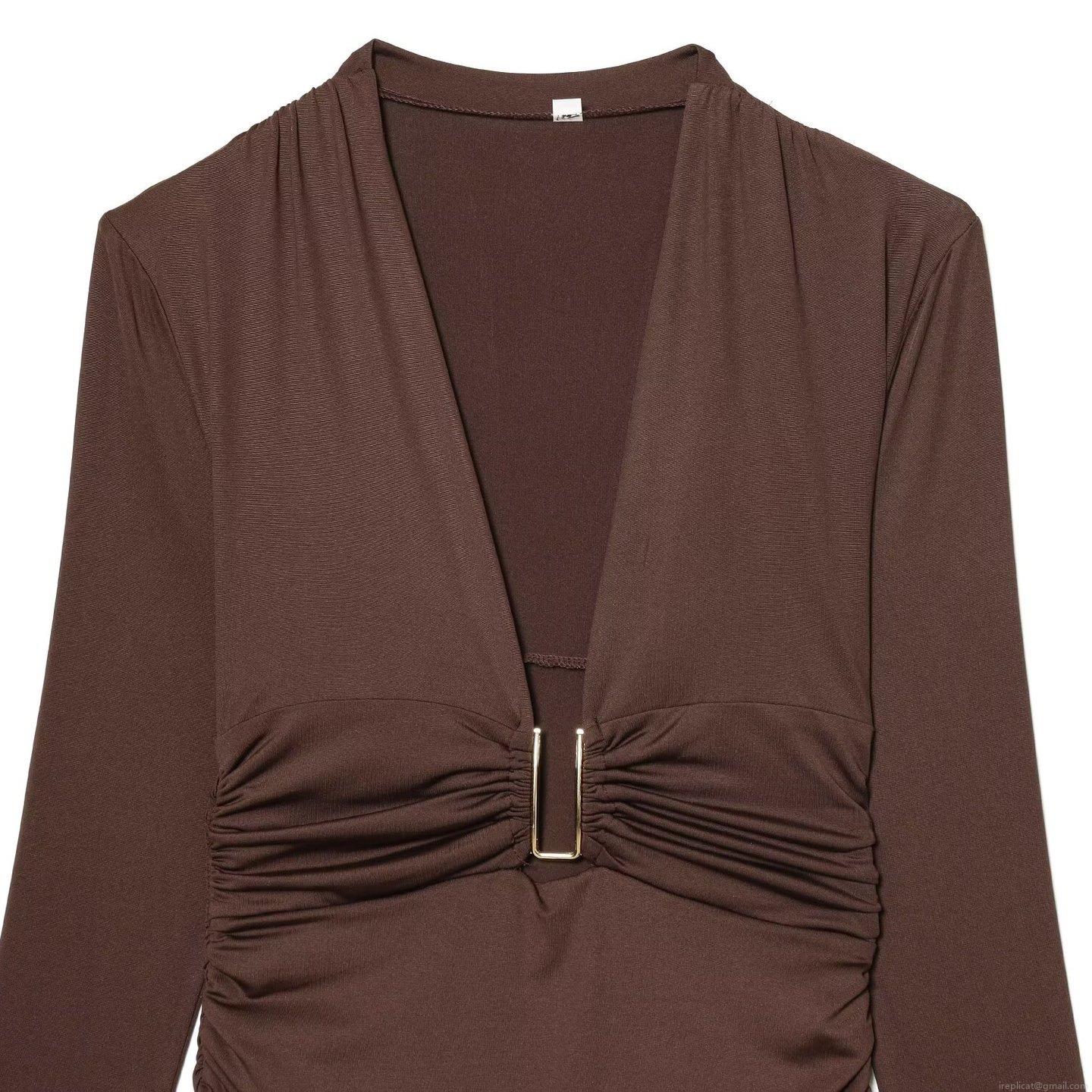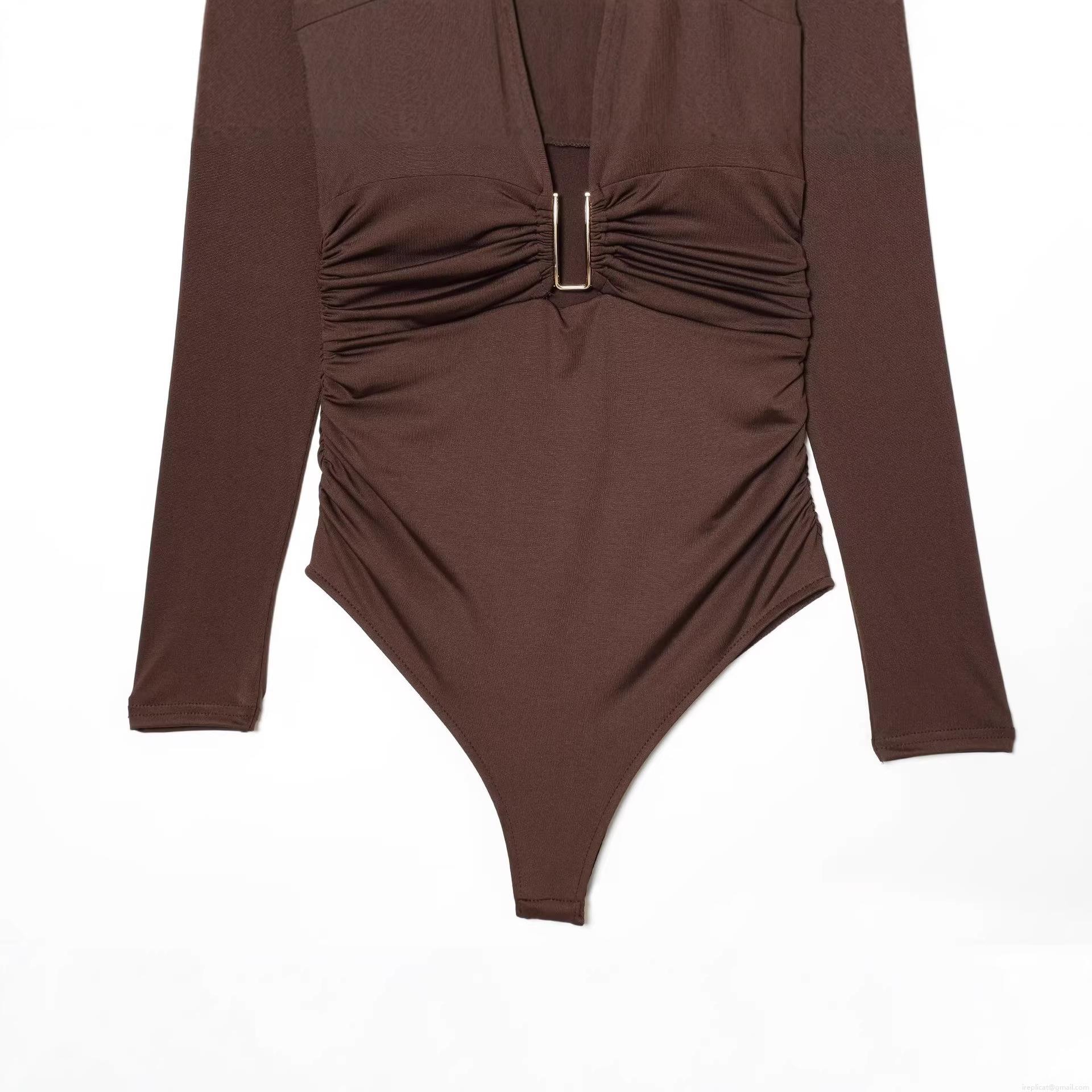 • Women's Sexy Deep V-Neck Long Sleeve Ruched Bodysuit With U-Shaped Metal Buckle Slim Fit Solid Brown One-Piece Jumpsuit For Party Clubwear