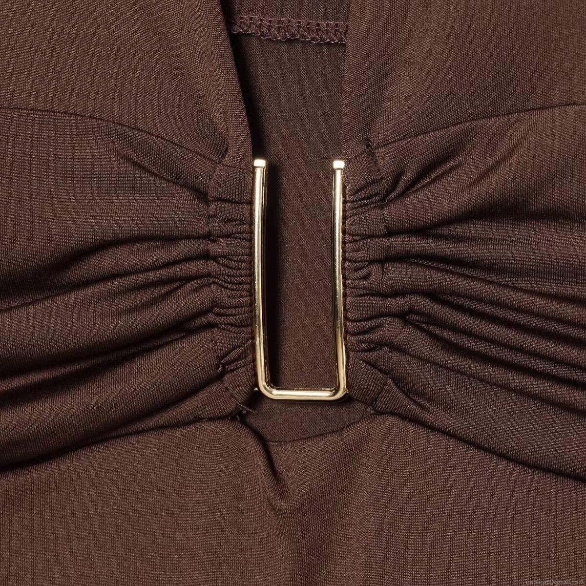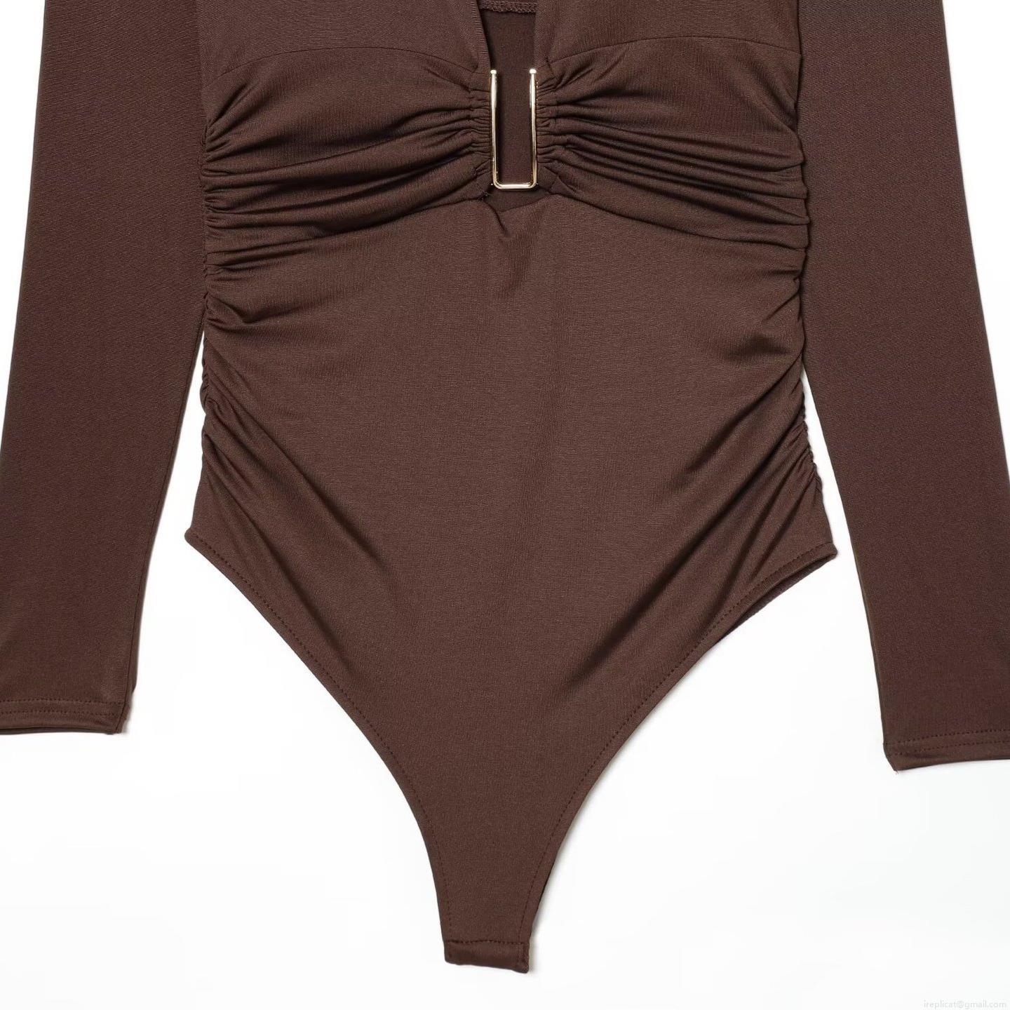 • Women's Sexy Deep V-Neck Ruched Long Sleeve Bodysuit With Gold Metal Buckle Coffee Nylon Spandex Slim Fit Thong Bodysuit For Party Clubwear