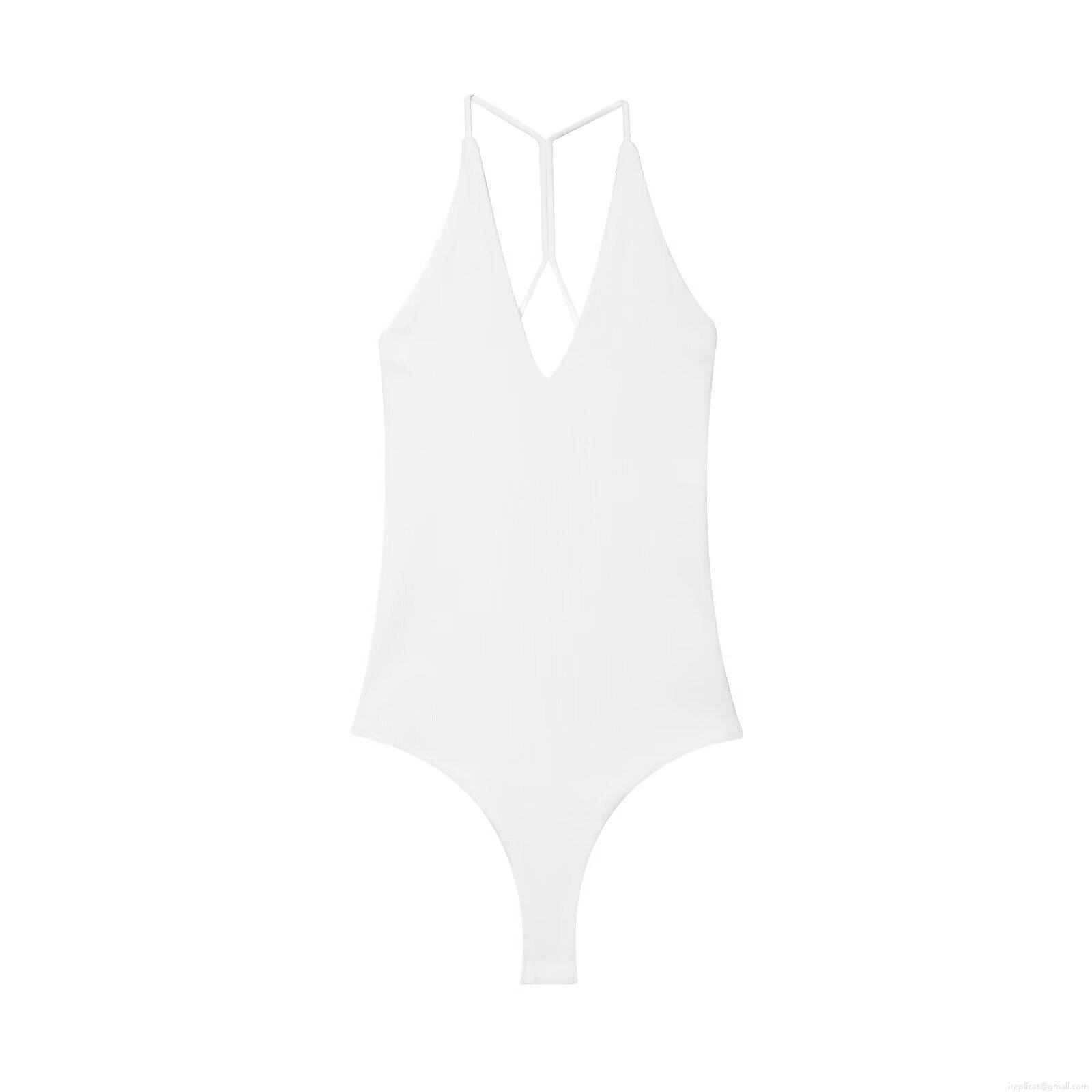 • Women's Sexy Halter Neck Deep V Bodysuit Ribbed Knit Backless Sleeveless Cross Strap Slim Fit Leotard Summer Jumpsuit Top