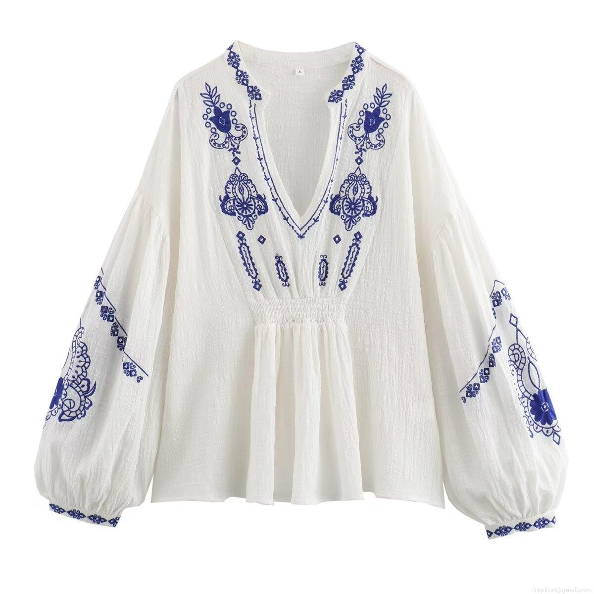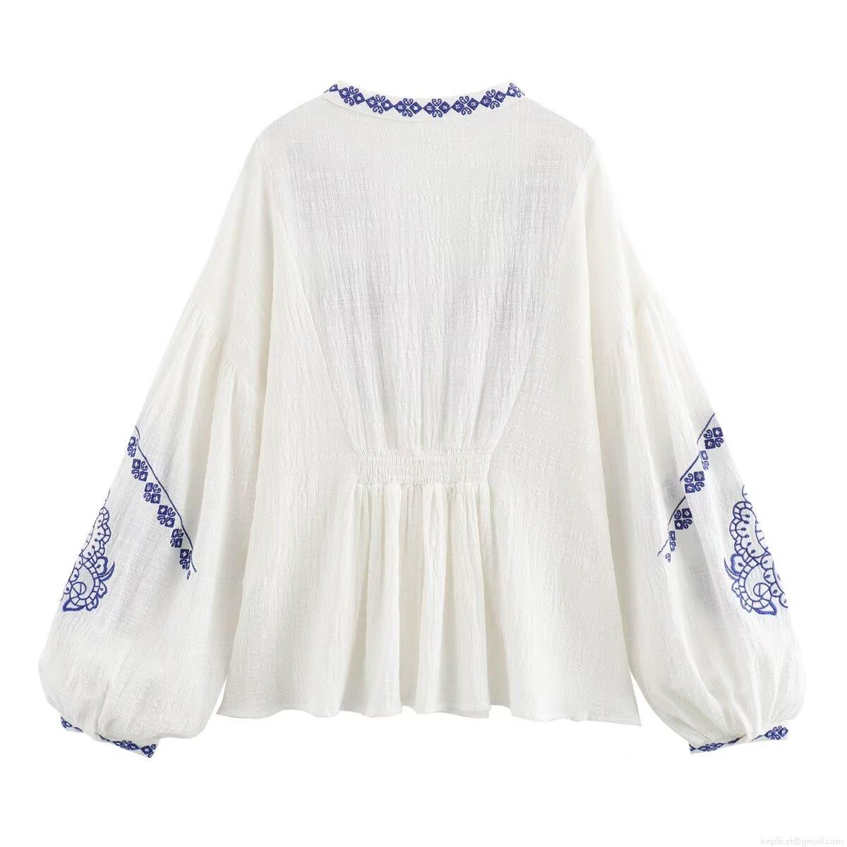 • Women's Bohemian 100% Cotton Blouse V-Neck Blue Floral Embroidered Lantern Sleeve Smocked Waist Western Style Summer Casual Top For Women