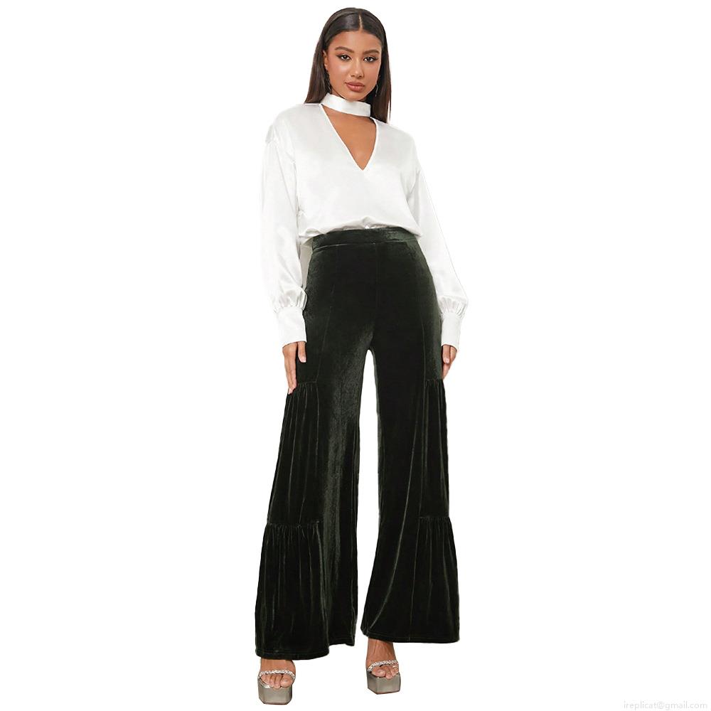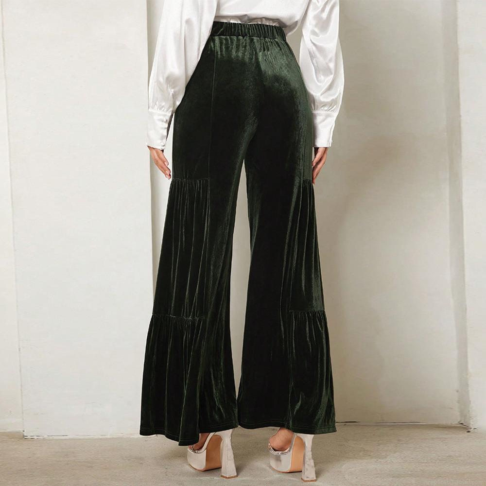 • Women Elegant Gold Velvet Wide Leg Pants High Waisted Ruffle Flowy Loose Velvet Trousers Solid Color Long Pants For Office Party Ladies