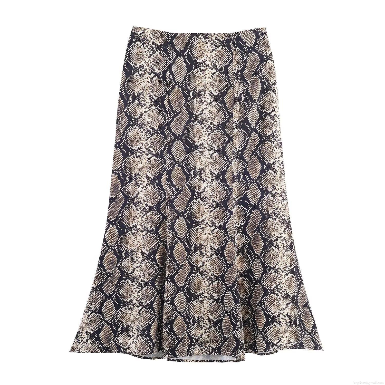 Women Fashion Snake Print Satin Midi Skirt High Waist A-Line Silky Polyester Skirt For Casual Party Office Chic Streetwear Ladies
