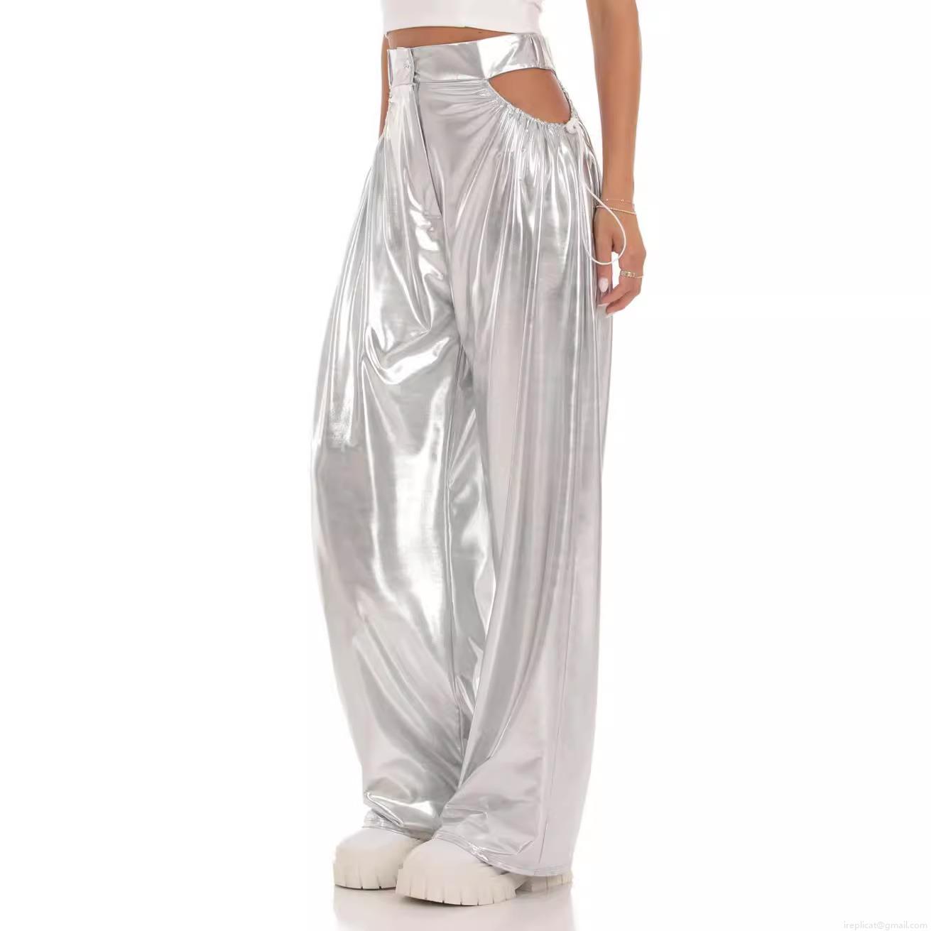 Solid Color, Hollow Out, Zipper, Hot Stamping, Drawstring, Metallic Color, Wide-leg, Metallic Texture