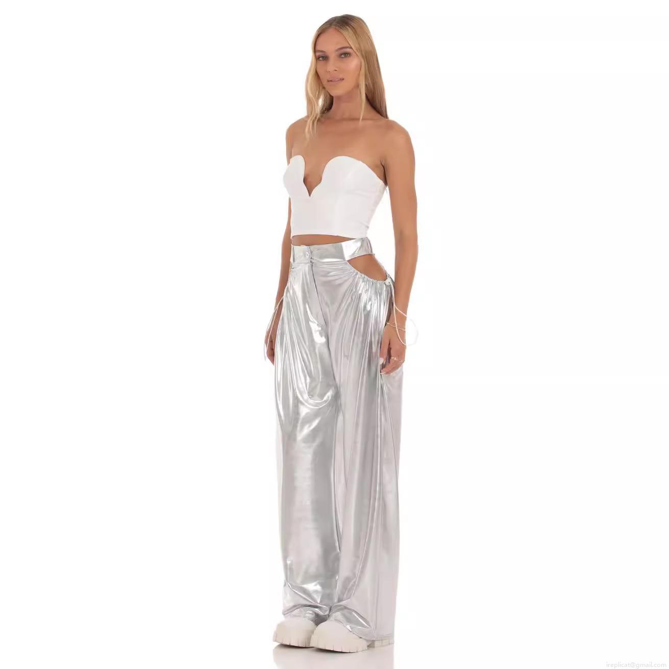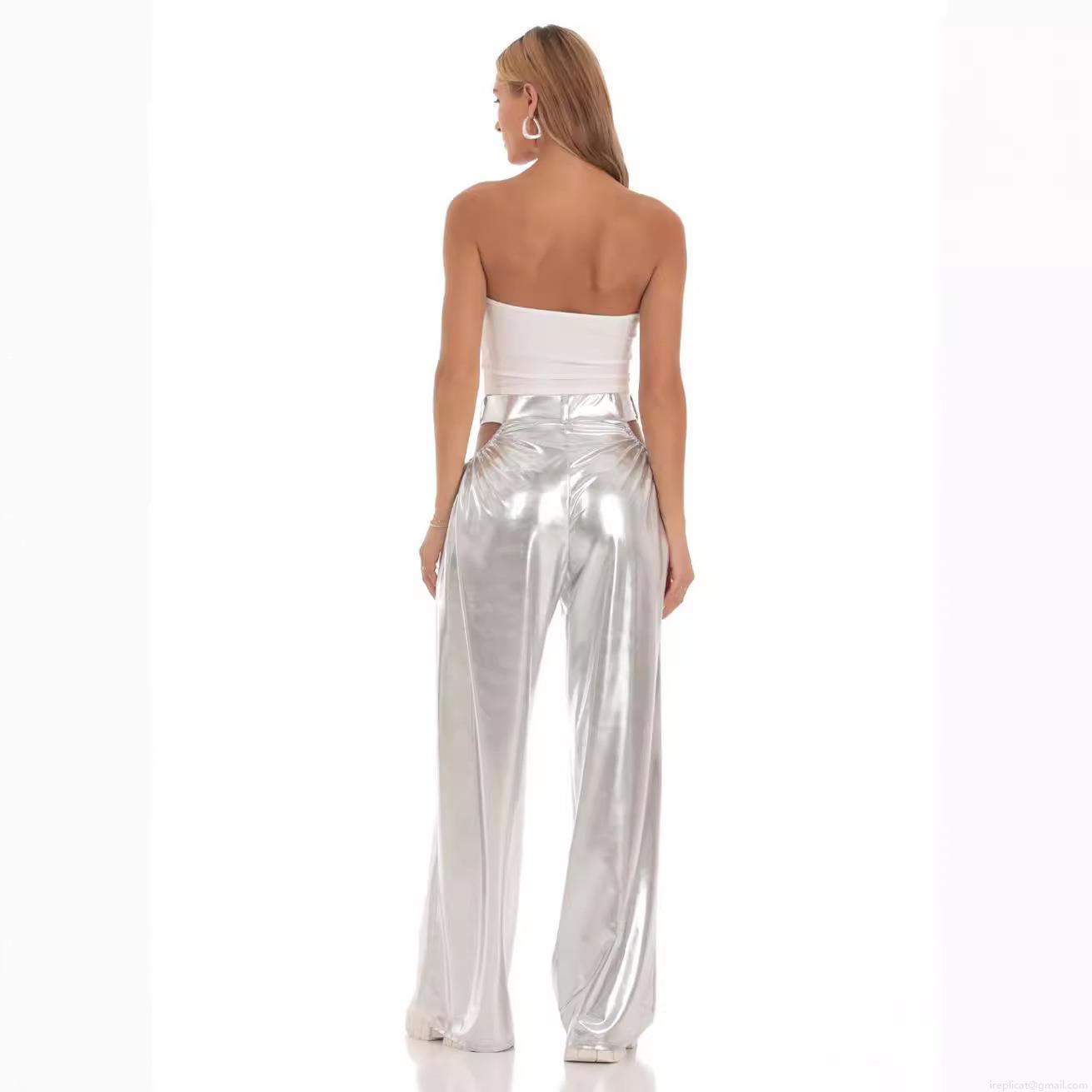 • Women High Waist Silver Metallic Wide Leg Pants With Side Cutout Sexy Drawstring Streetwear Loose Long Trousers Shiny Polyester Club Party Night Out Fashion Trousers