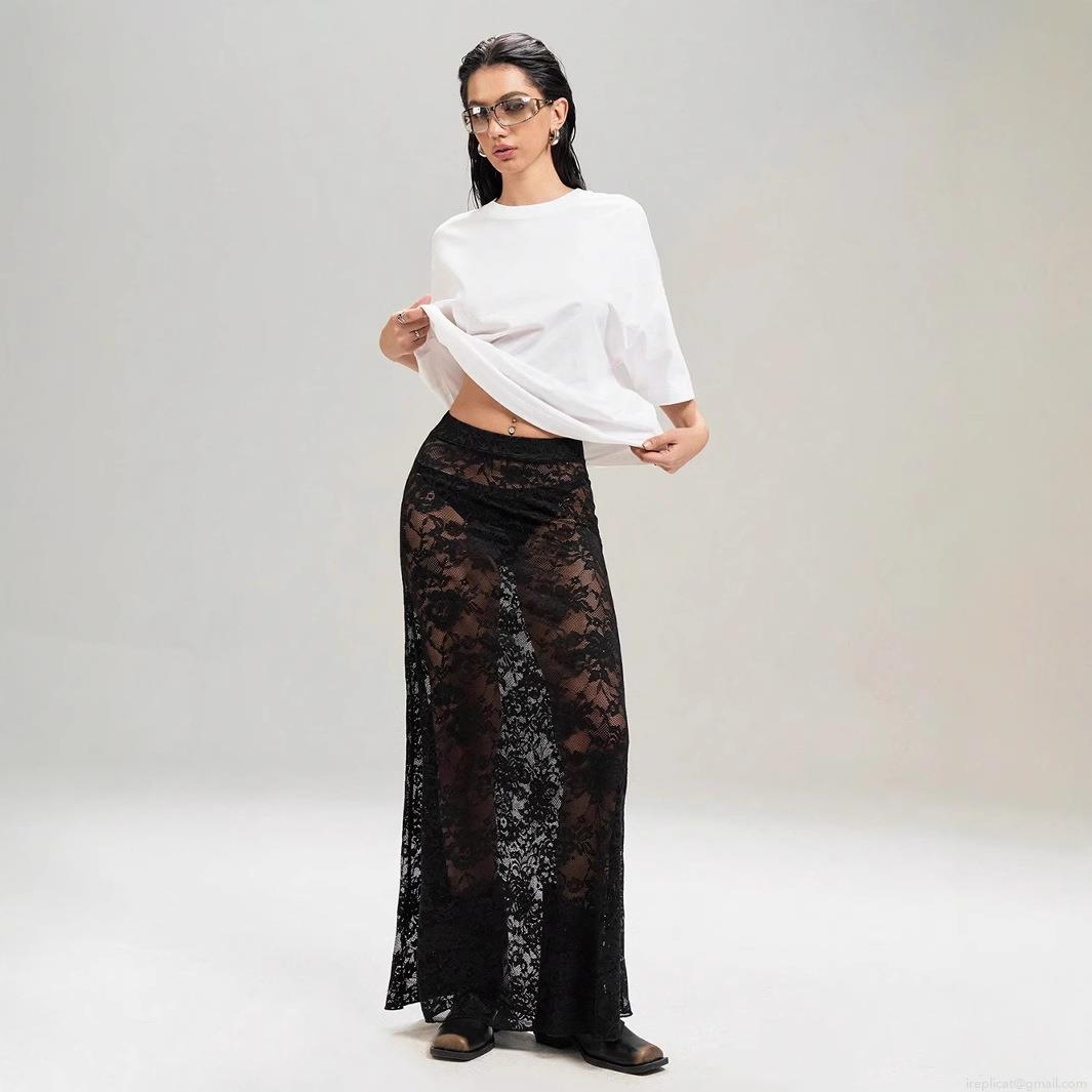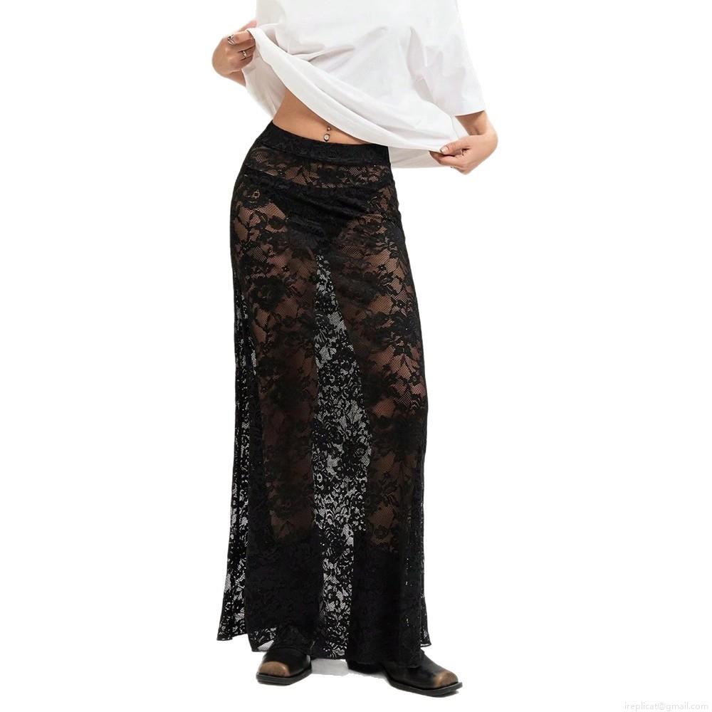 Women Sexy Floral Lace See-Through Midi Skirt High Waist Mesh Hollow Out Streetwear Summer Party Bodycon Long Skirts