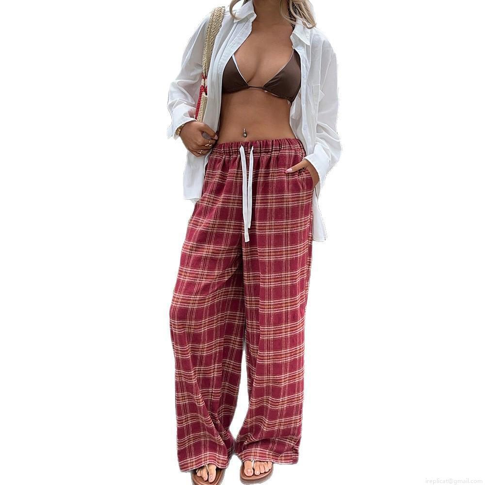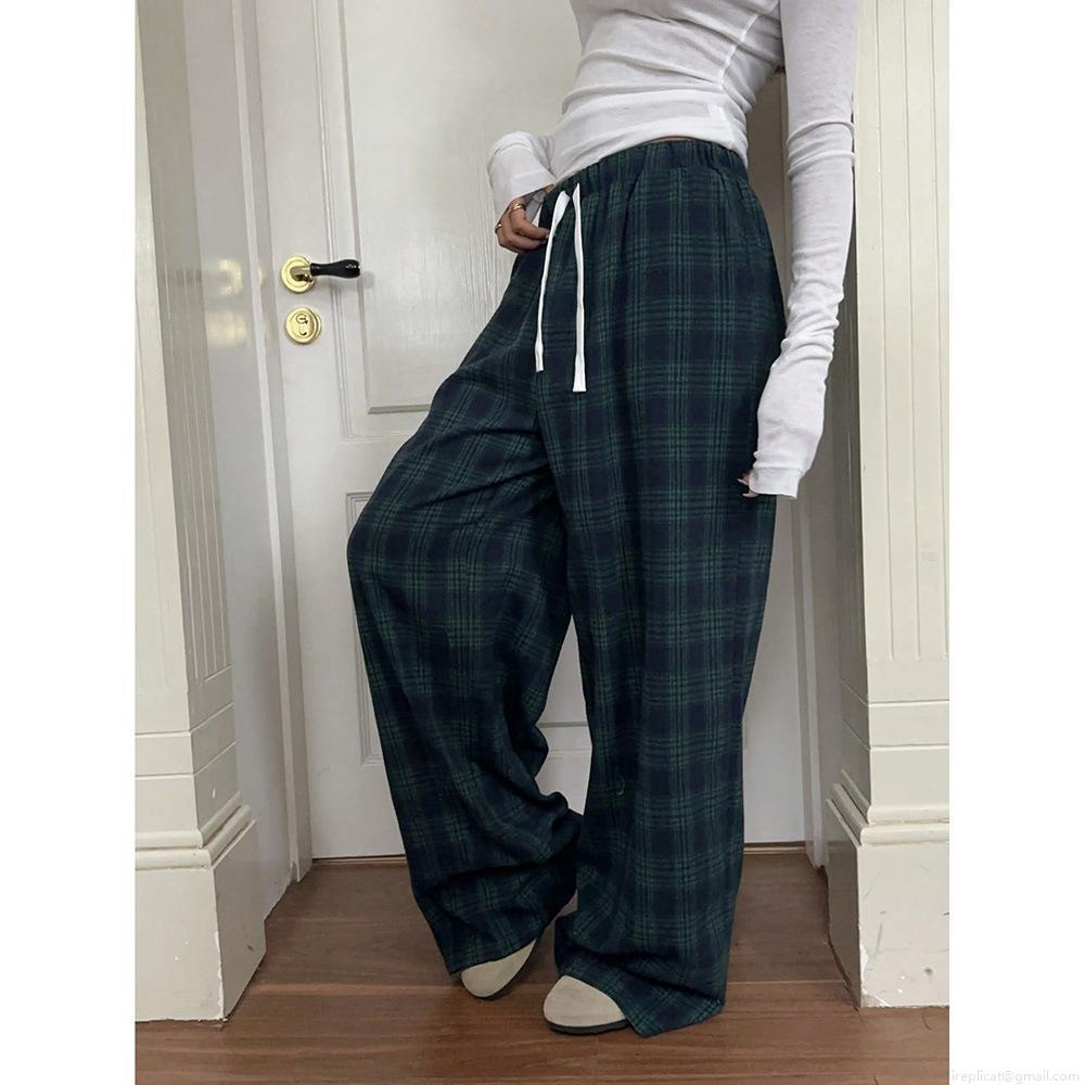 • Women's American Retro Plaid Wide Leg Pants Loose Casual Contrast Color Trousers Streetwear Drawstring Plaid Pants with Letter A Patch Cotton Blend