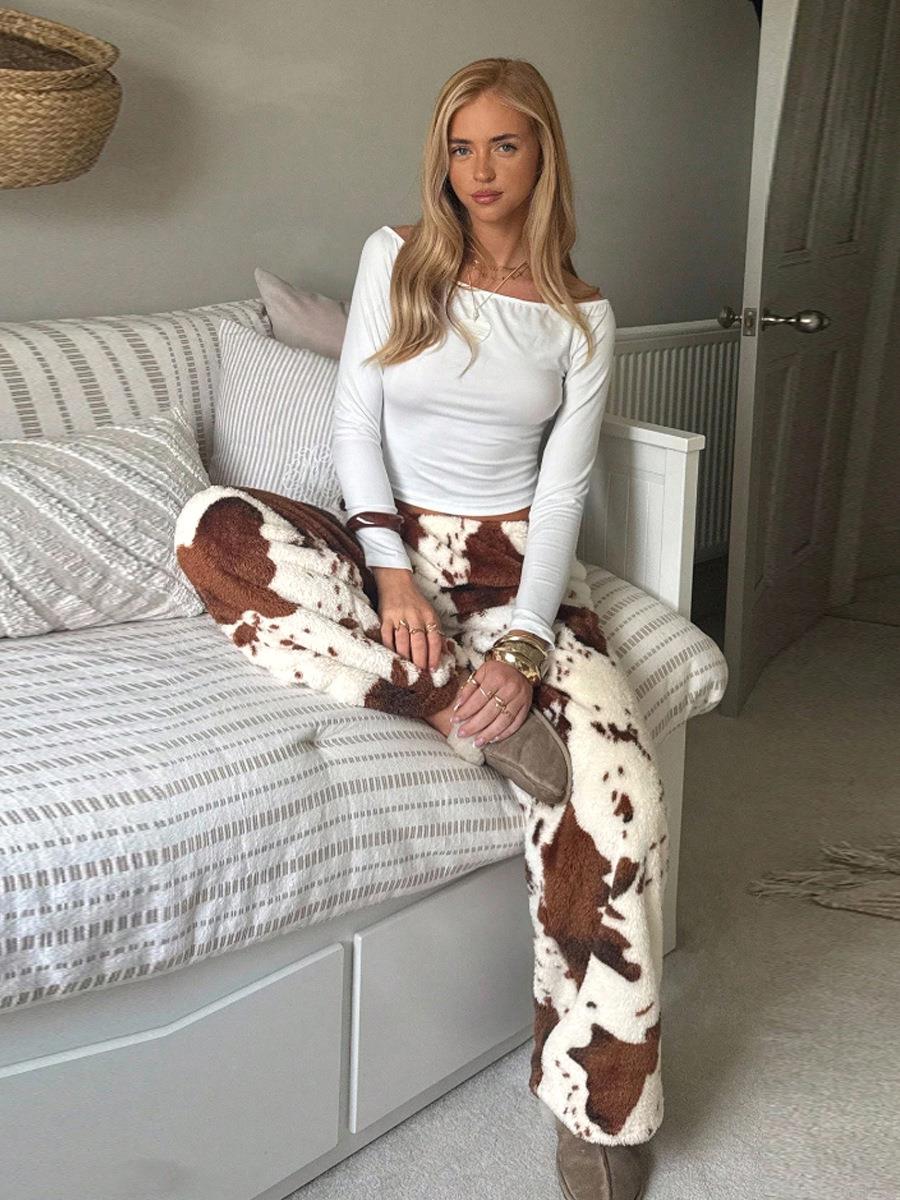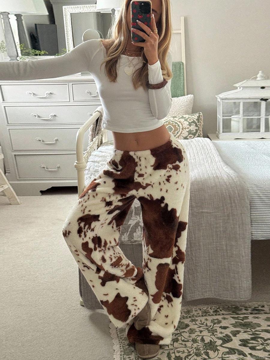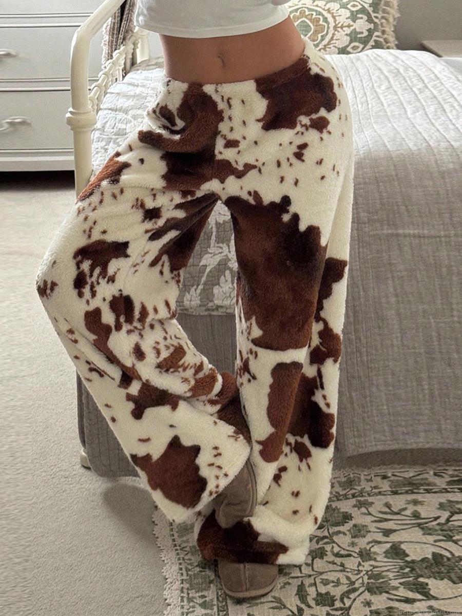 • Women's Cow Print Fleece Wide Leg Pants Casual Warm Plush Lounge Trousers For Home Autumn Winter Animal Print Pajama Bottoms