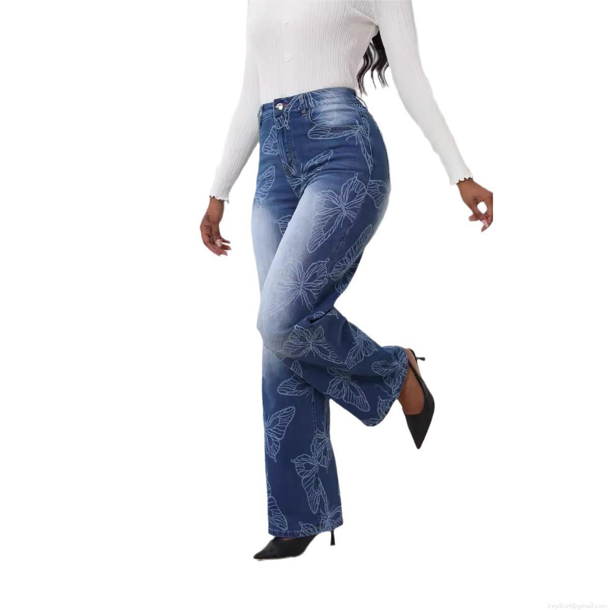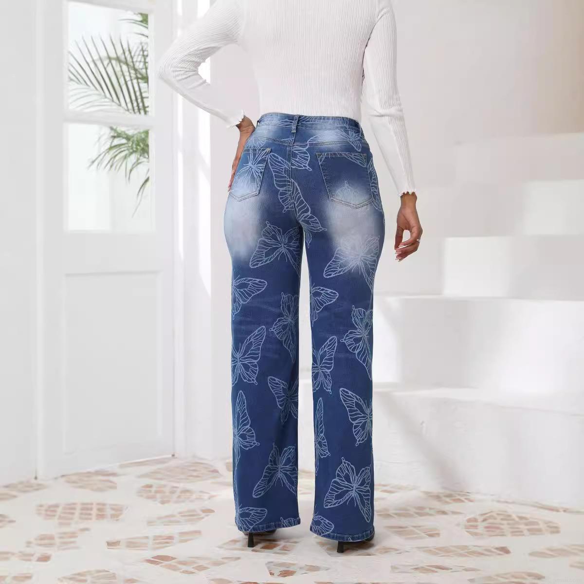 • Women's High Waist Straight Leg Denim Jeans With All-over Butterfly Print Casual Loose Blue Washed Long Pants For Women Streetwear