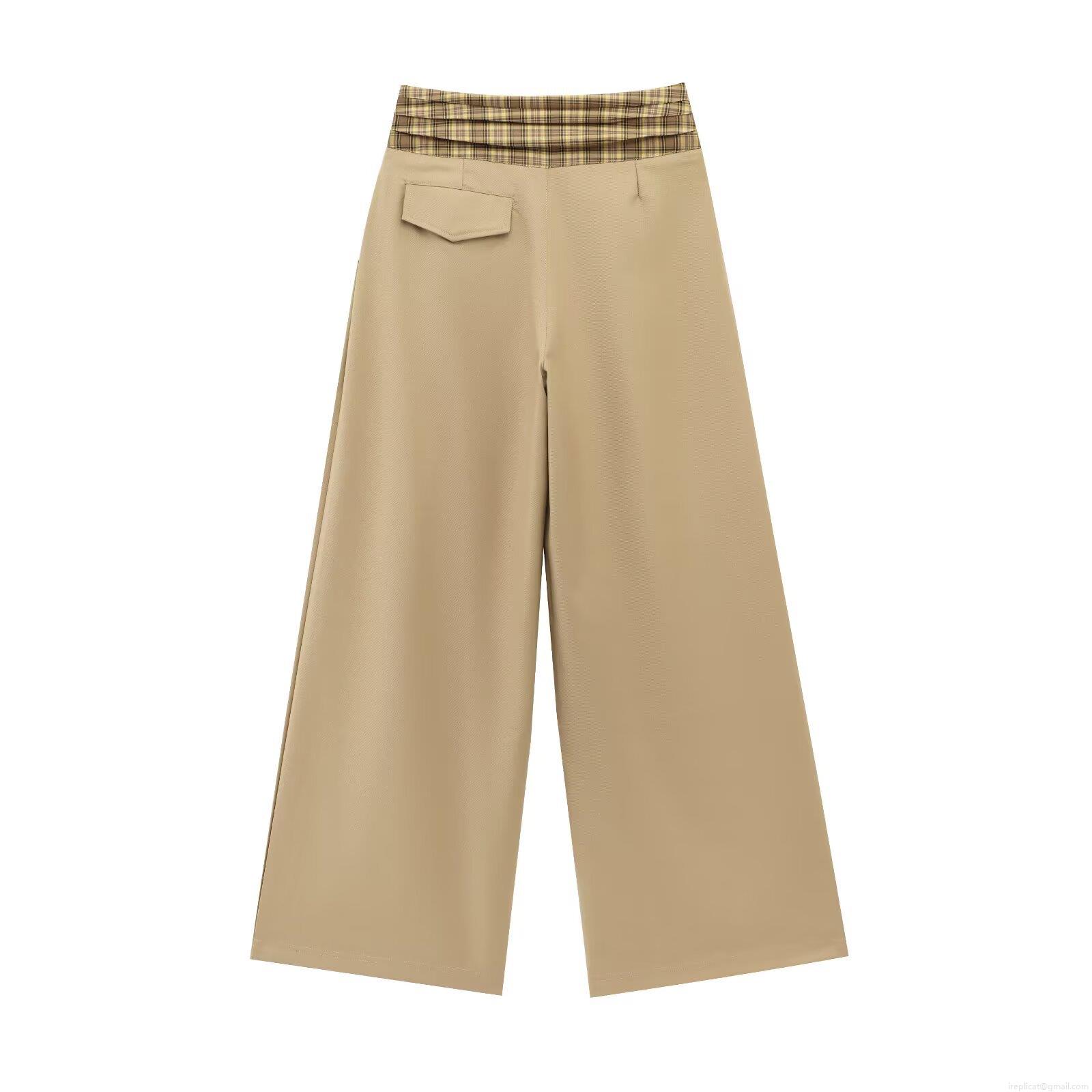 Women's High Waisted Wide Leg Trousers With Plaid Patchwork Waistband Chic Polyester Twill Pleated Straight Casual Long Pants For Daily Streetwear Khaki