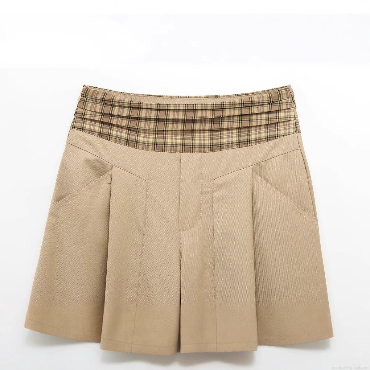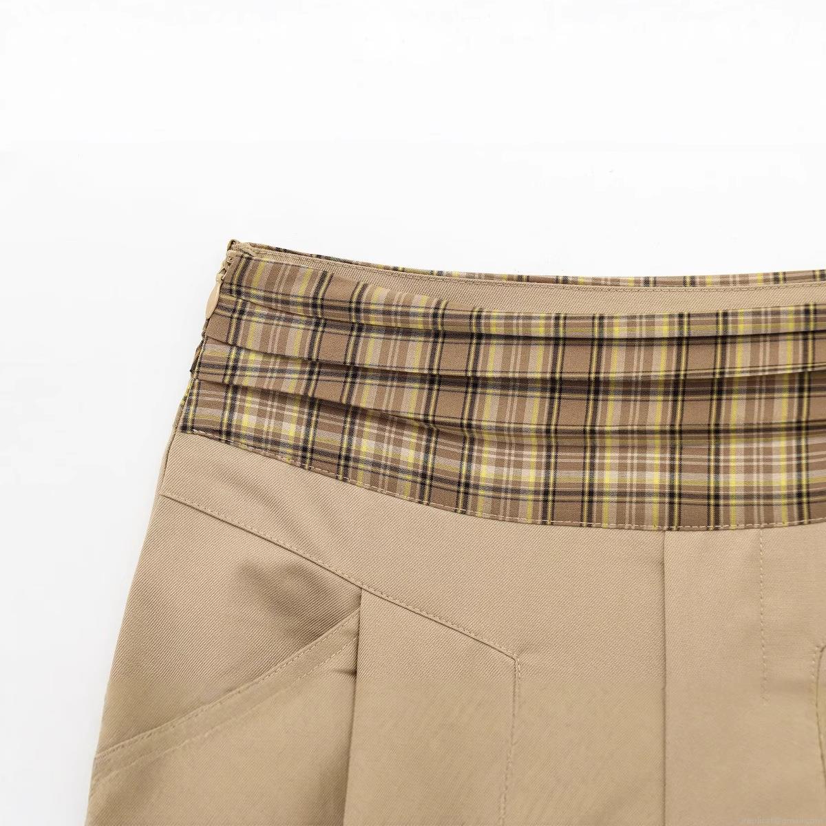Checkered Pattern, Plaid Patchwork, 3d Pleats, Color-blocked Waistband