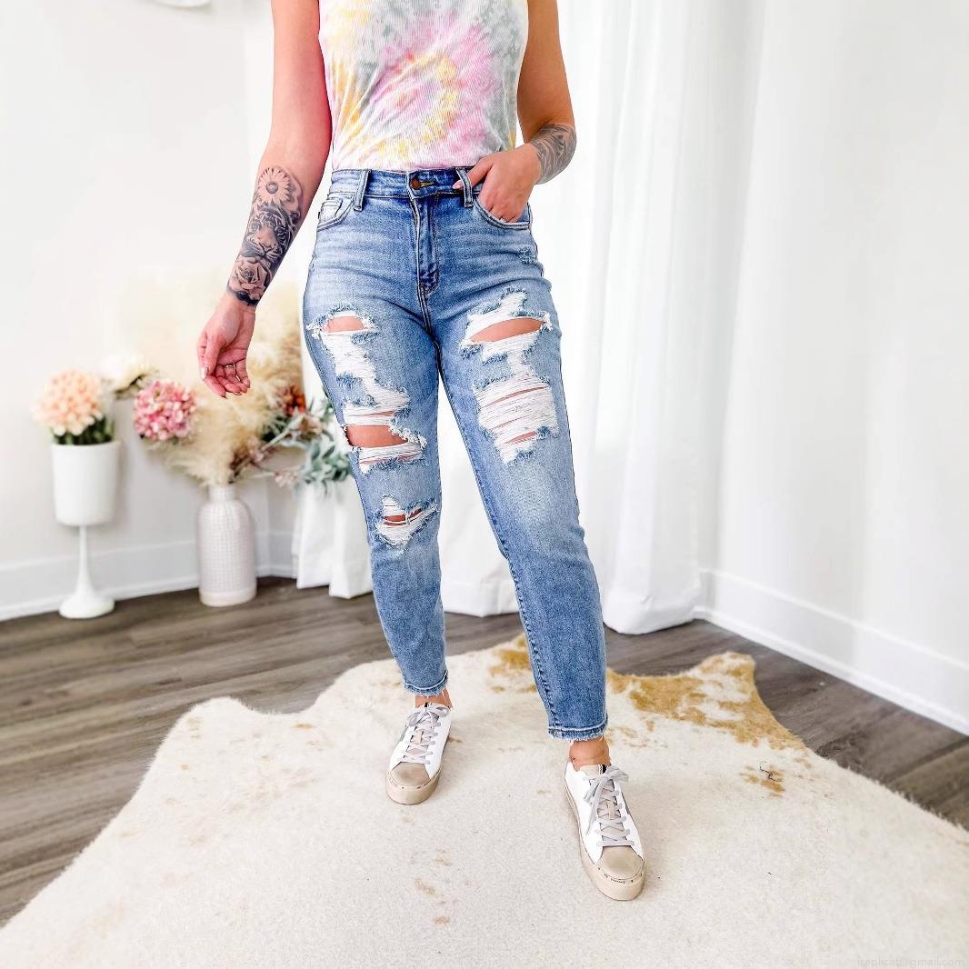Women's Sexy Ripped Distressed Skinny Jeans Mid Waist Light Blue Washed Cotton Polyester Blend Denim Pencil Pants Streetwear Long Trousers