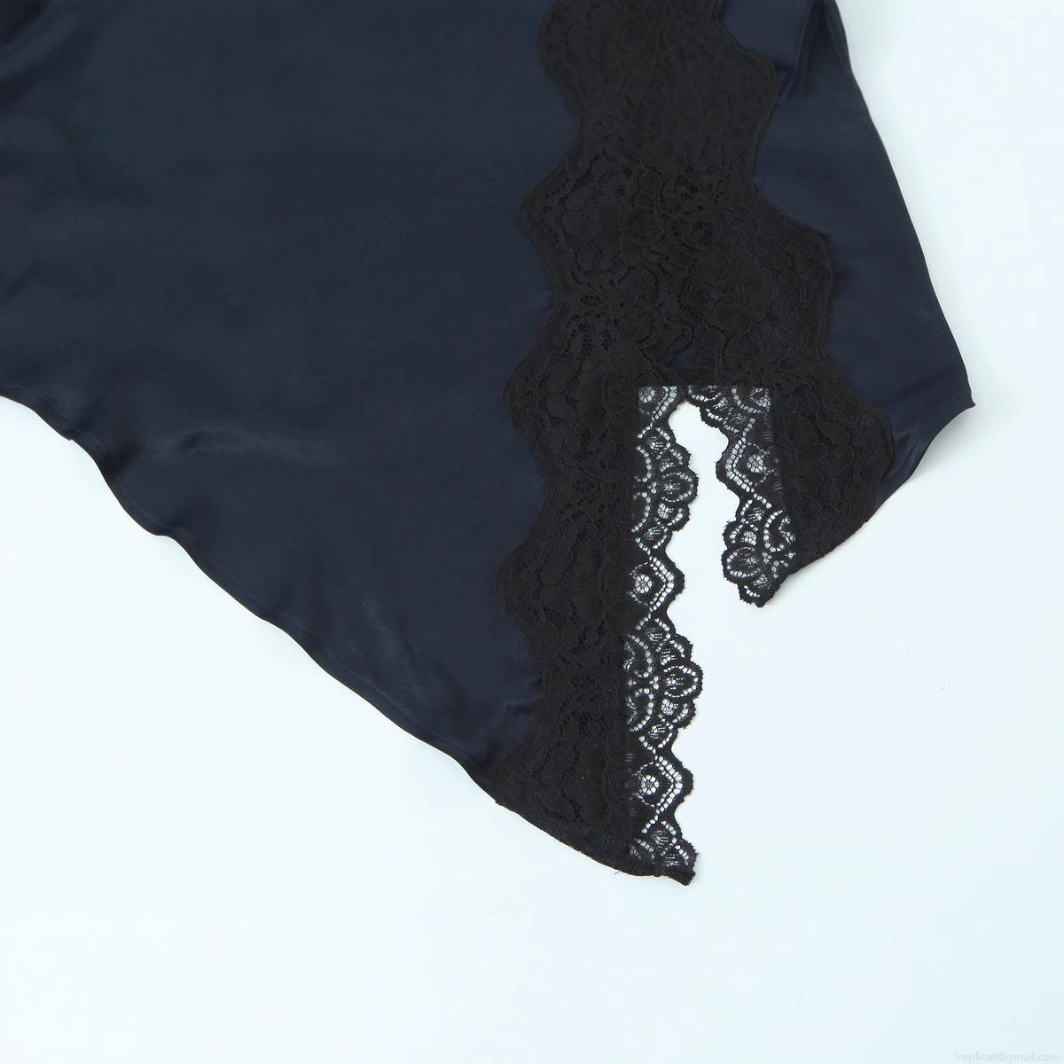Women's Sexy Satin Mini Skirt With Lace Trim Patchwork Asymmetrical Hem Solid Navy Blue Street Style Short Skirt For Club Party Night Out