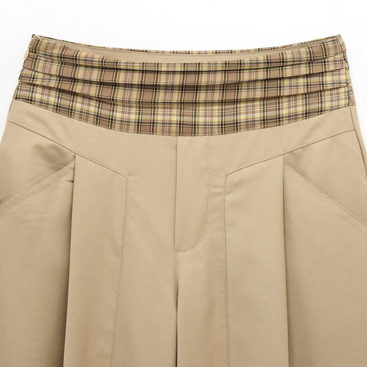 • Women's Vintage Khaki Wide Leg Pants Plaid Patchwork High Waisted Cotton Blend Twill Trousers With Pockets Casual Loose Chic Streetwear Bottoms