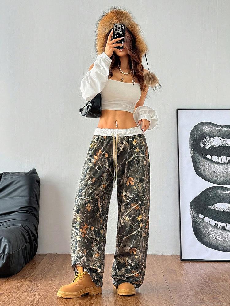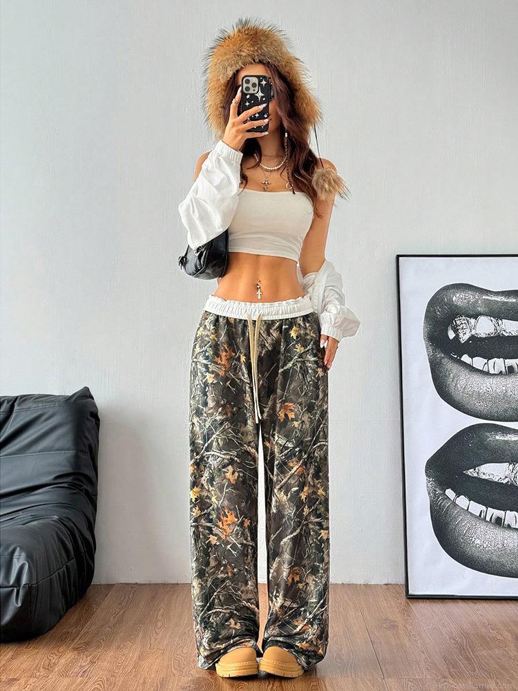 • Women's Camouflage Wide Leg Pants High Waist Elastic Drawstring Trousers Gothic Cross Print Streetwear Loose Full Length Casual Forest Jungle Pants