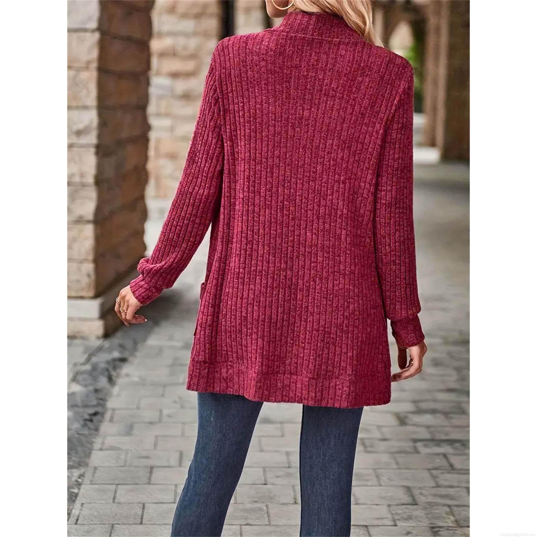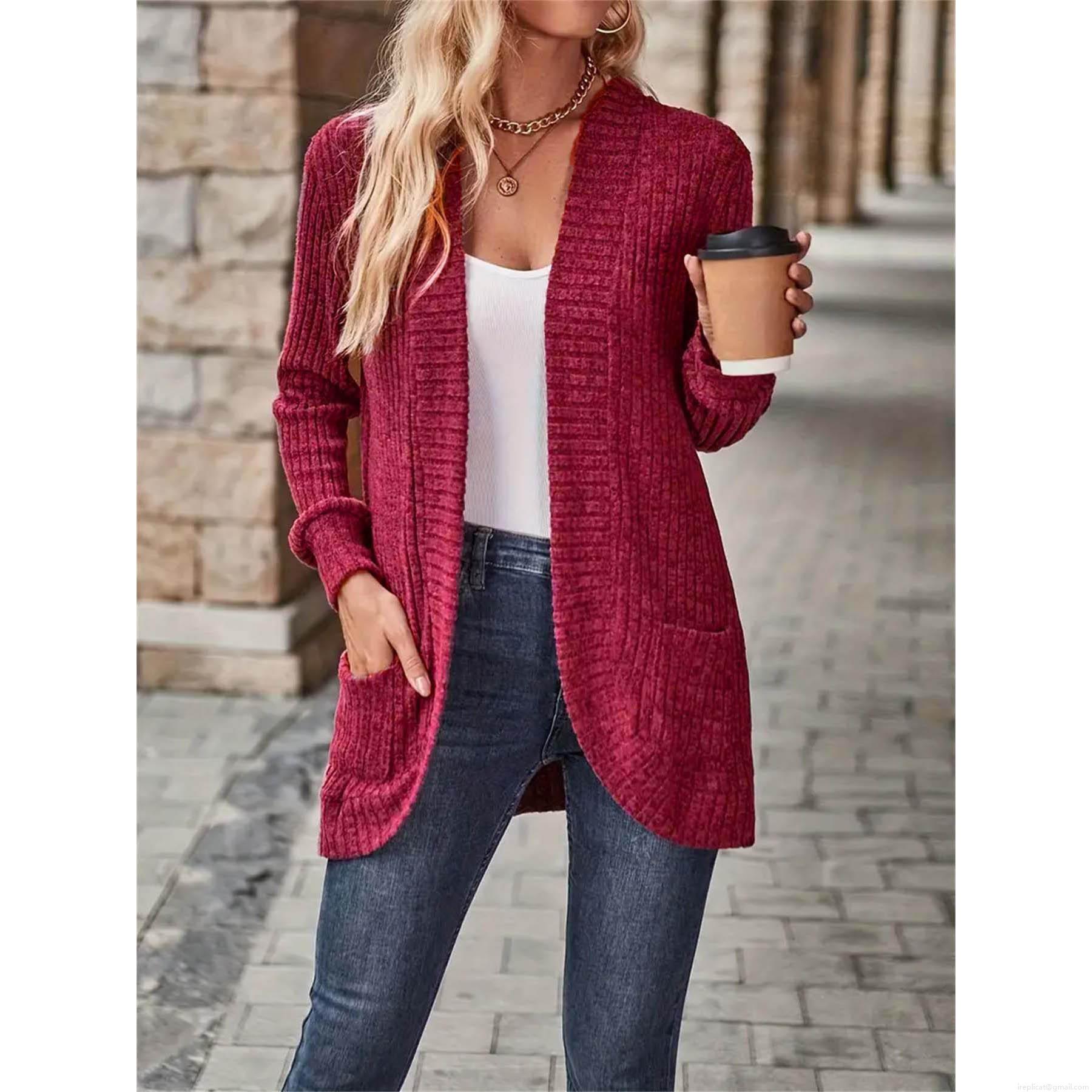 • Women's Casual Knit Cardigan Open Front Long Sleeve Ribbed Sweater Jacket With Pockets Solid Color Vintage Outerwear For Fall Winter