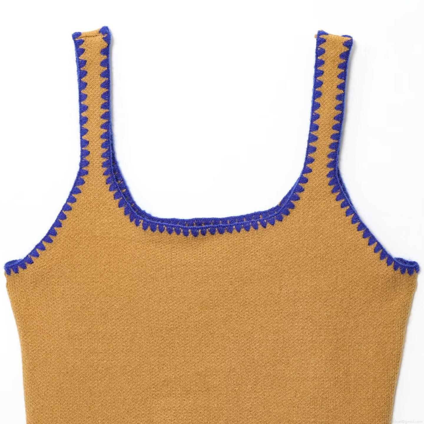 • Women's Casual Knitted Two-Piece Set Contrast Crochet Wave Trim Button Cardigan and Camisole Vest Autumn Outfits Knitted Sweater Set for Women