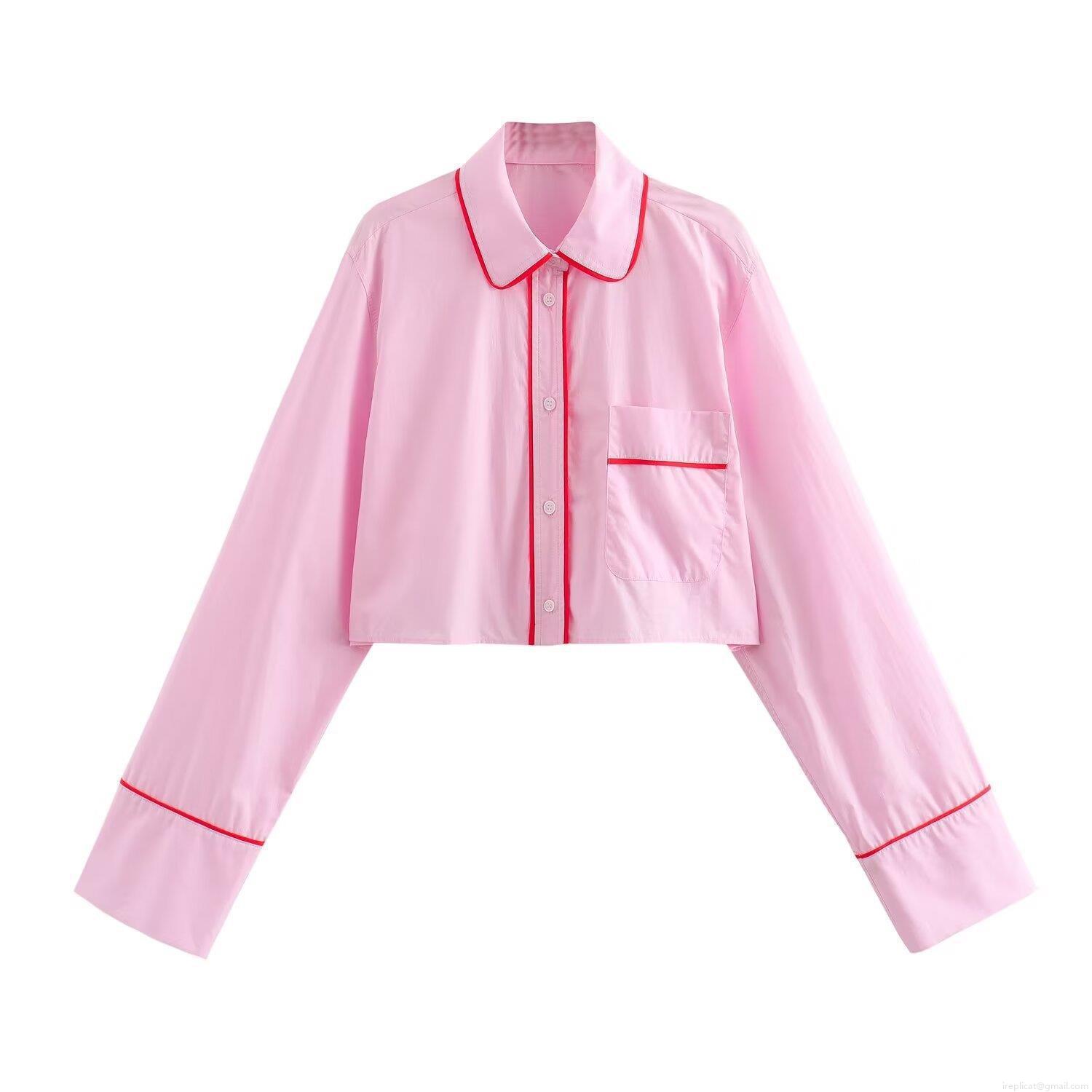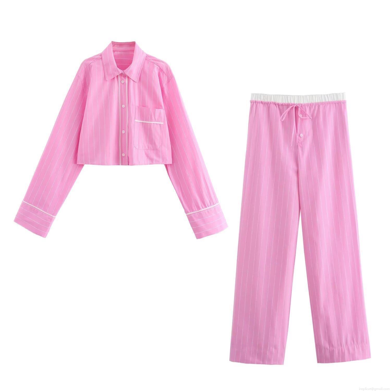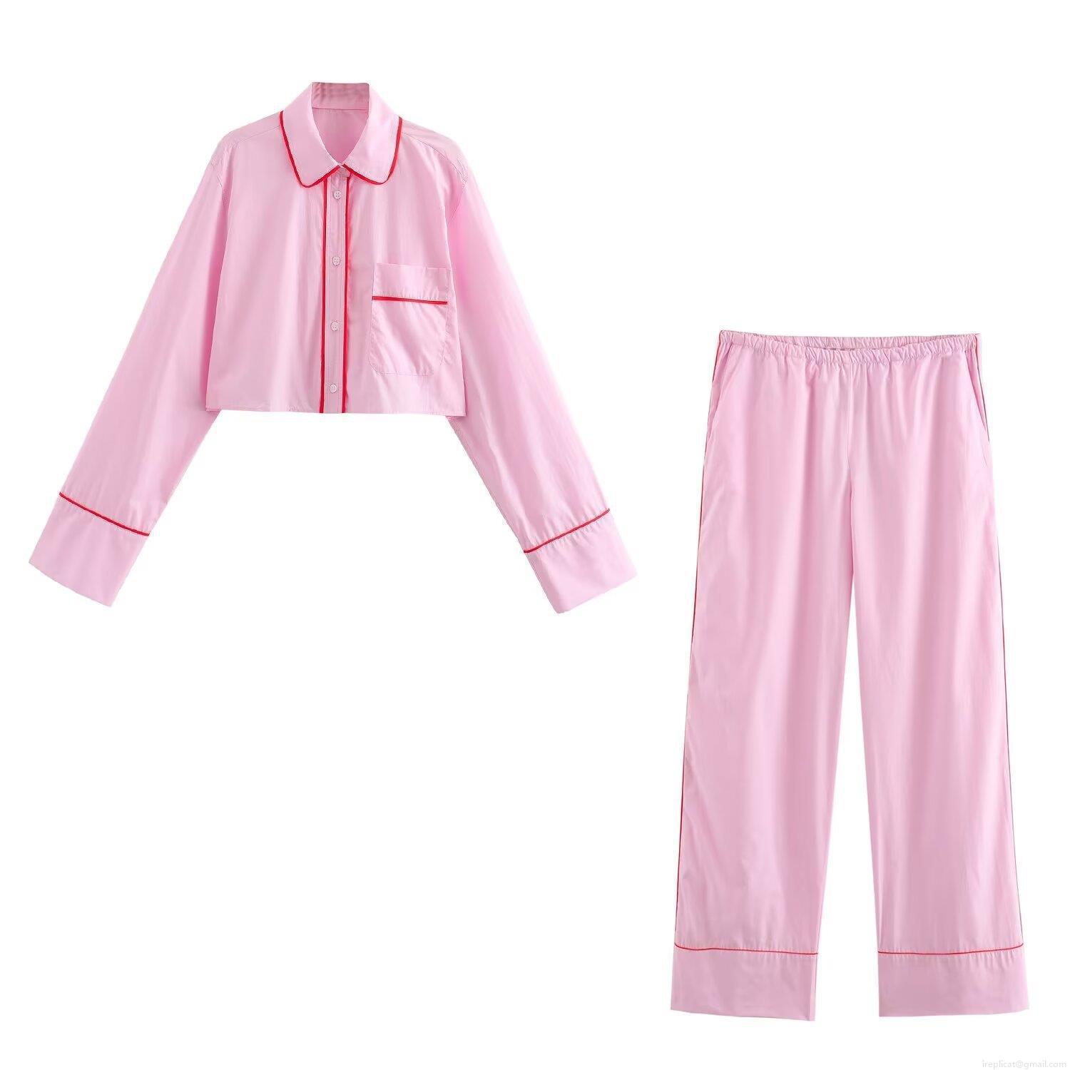 Women's Casual Pink Loungewear Set Contrast Piping Poplin Long Sleeve Cropped Shirt And High Waisted Straight Pants Pajama Set Fashion Streetwear Two Piece Set
