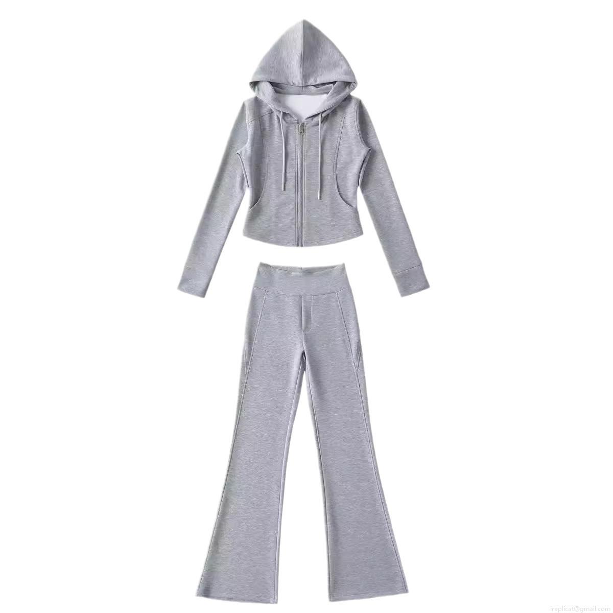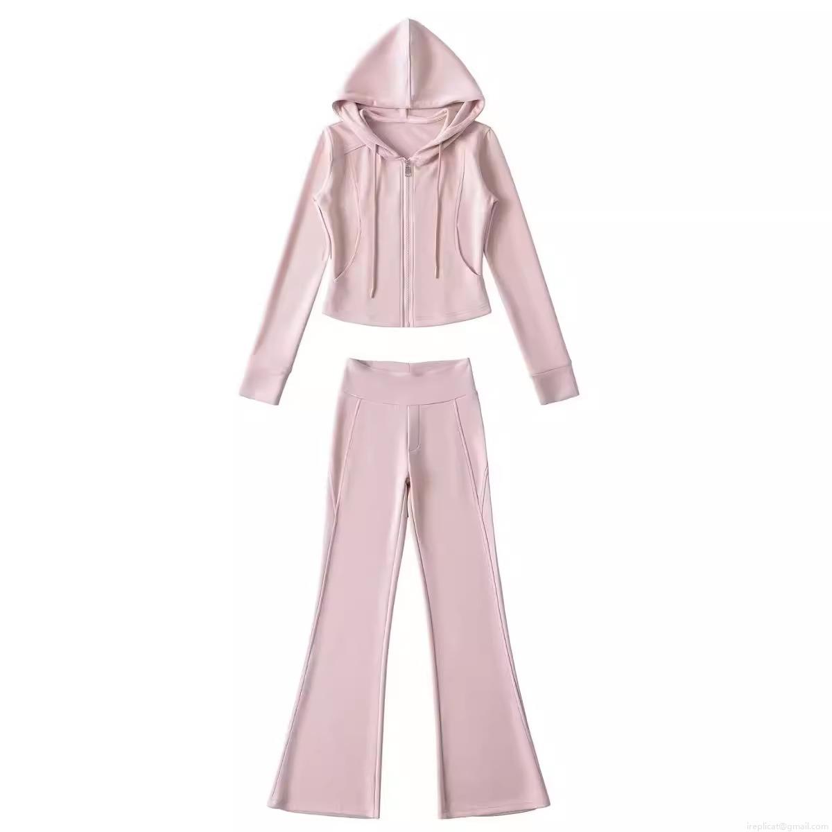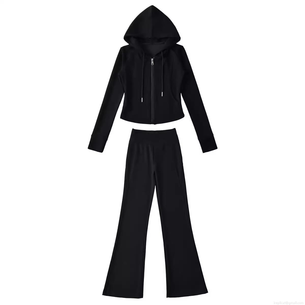 • Women's Casual Sports Set Polyester Zip Up Short Hoodie Jacket and High Waist Micro Flare Pants 2 Piece Lounge Yoga Outfits Solid Color