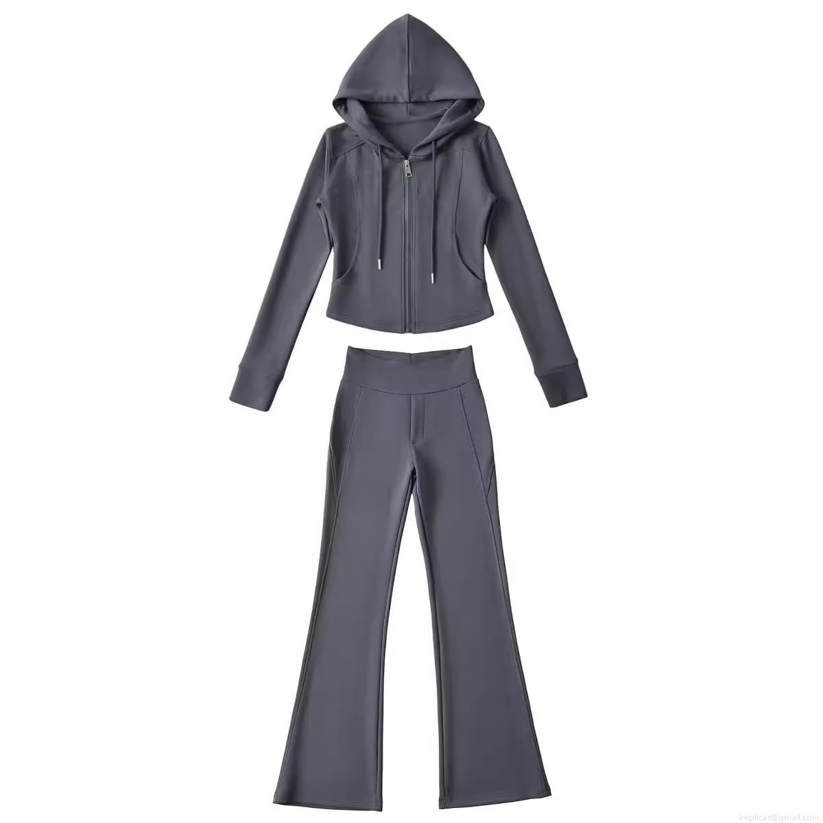 Women's Casual Sports Set Polyester Zip Up Short Hoodie Jacket and High Waist Micro Flare Pants 2 Piece Lounge Yoga Outfits Solid Color