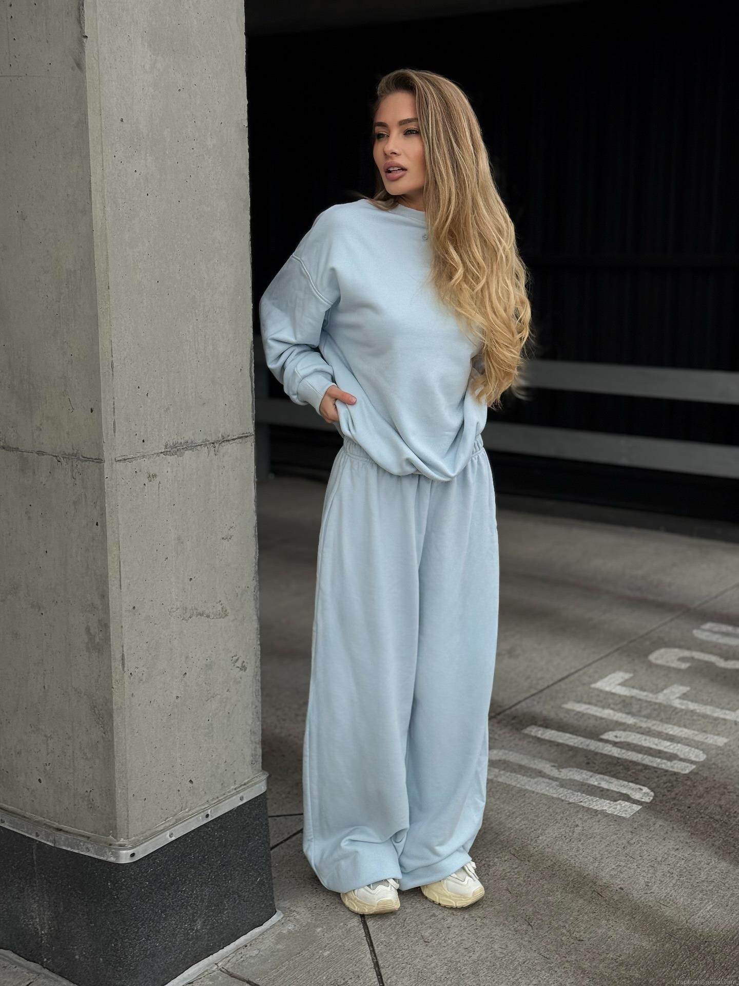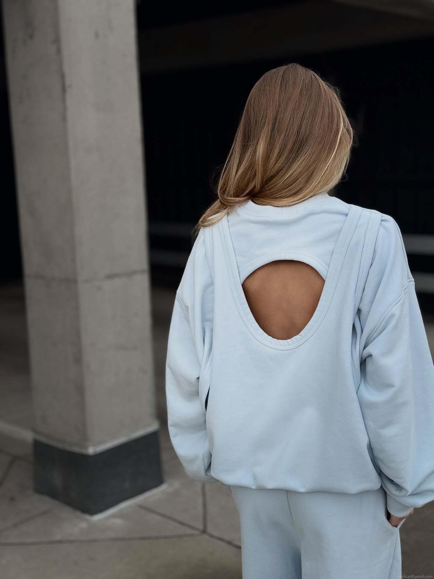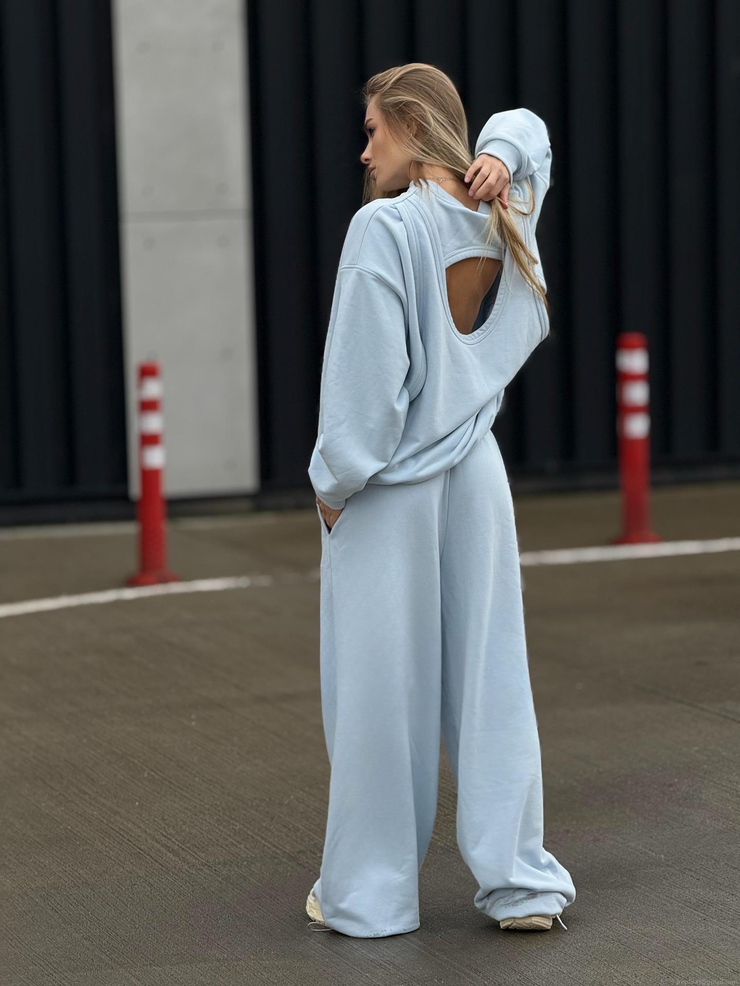 • Women's Casual Two Piece Set Backless Hollow Out Design Long Sleeve Sweatshirt And High Waist Wide Leg Long Pants Streetwear Loose Fit Tracksuit Light Blue Outfit